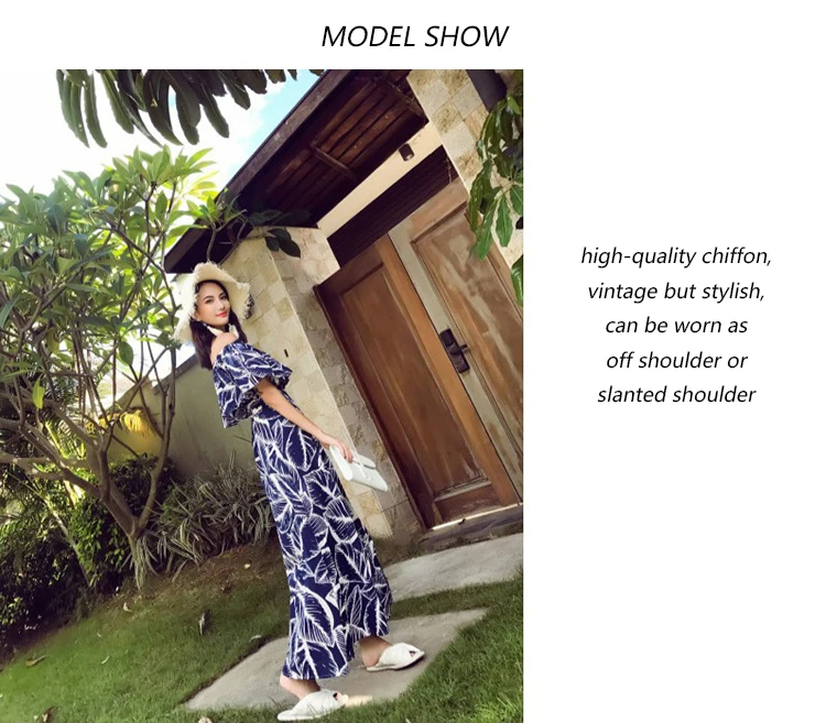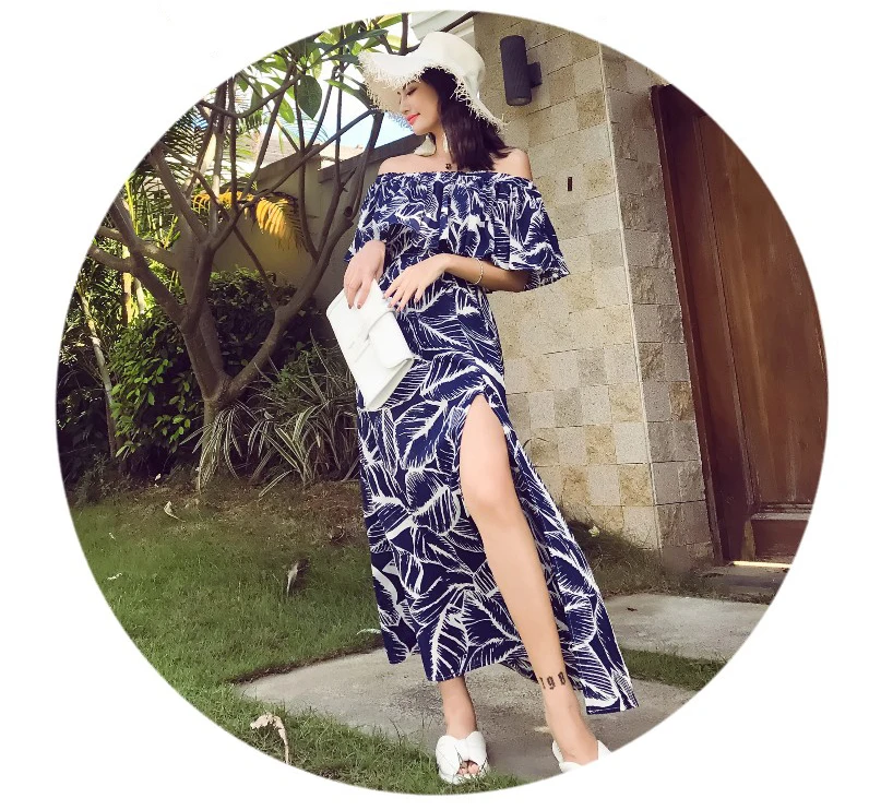 Летнее женское синее платье с принтом, Элегантное Длинное Тропическое платье без бретелек для отпуска, корейский шифоновый пляжный Сарафан Макси