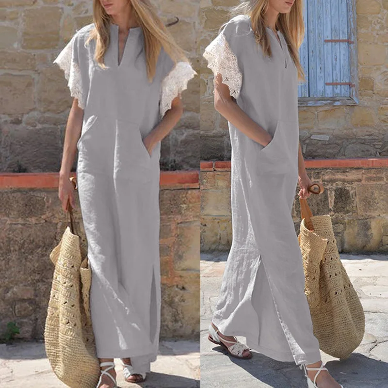 * Описание товара: женское удобное хлопковое и льняное кружевное платье с короткими рукавами; Длинная юбка; большие размеры