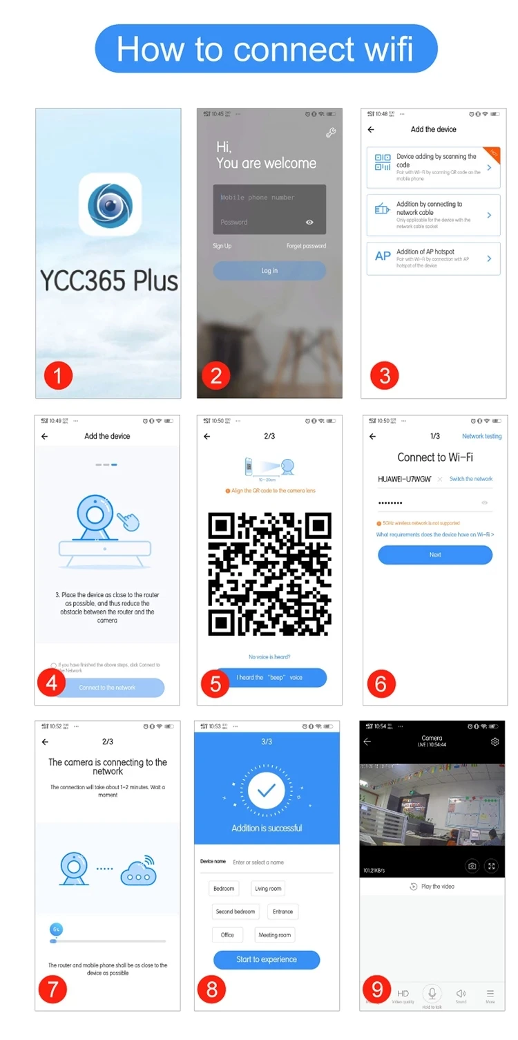 1. Скачайте и установите приложение А. Убедитесь, что ваши мобильные устройства правильно подключены к сети (Wi-Fi) B. Для пользователей телефонов Android, скачайте бесплатное приложение, путем поиска «YCC365» в «Google Play Store» или сканирования QR-кода на упаковке камеры. С. Для пользователей iPhone или iPad, скачайте бесплатное приложение, путем поиска «YCC365» в «app Store» или сканирования QR-кода на упаковке камеры. 2. Подключите облачную IP-камеру A. Откройте свое приложение "YCC365", закажите новую учётную запись или авторизуйтесь в своей старой учётной записи B. Добавьте устройство камеры (вы можете выбрать четыре способа добавить камеру) В. Когда вы добавляете свою камеру, пожалуйста, поместите камеру в место, где стабильный сигнал Wi-Fi (приблизьте телефон и камеру)