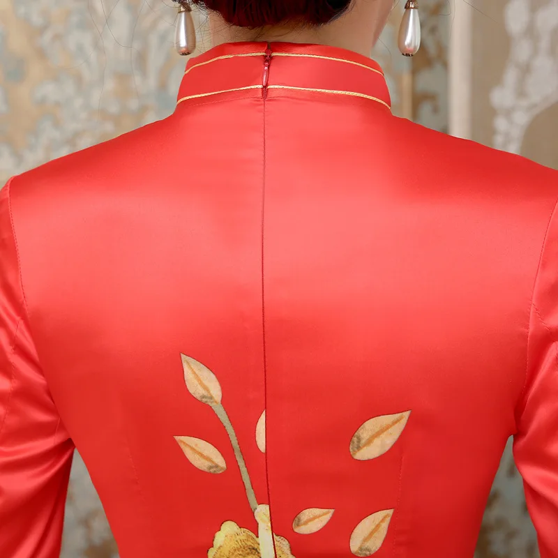 Шэн Коко размера плюс Китай красный низ Золотой Цветок атласные Cheongsam с длинными рукавами Qipao традиционные китайские платья невесты |
