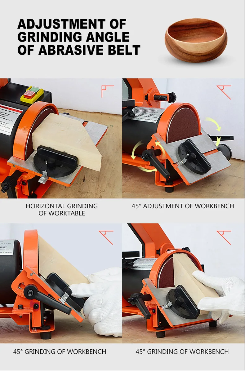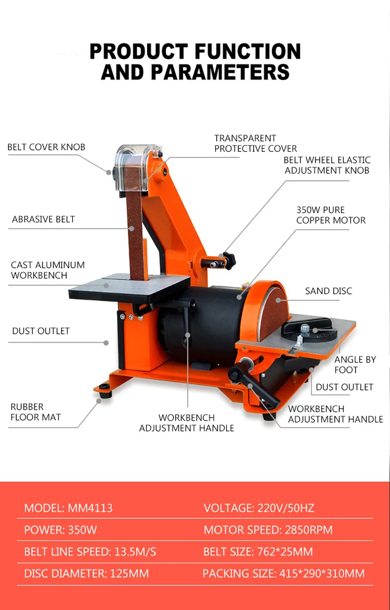 Напряжение: 220 В/50 Гц Мощность: 350 Вт Скорость двигателя: 2850 об/мин Поточная Линия скорость: 13,5 м/с Размер ремня: 762*25 мм Диаметр диска: 125 мм