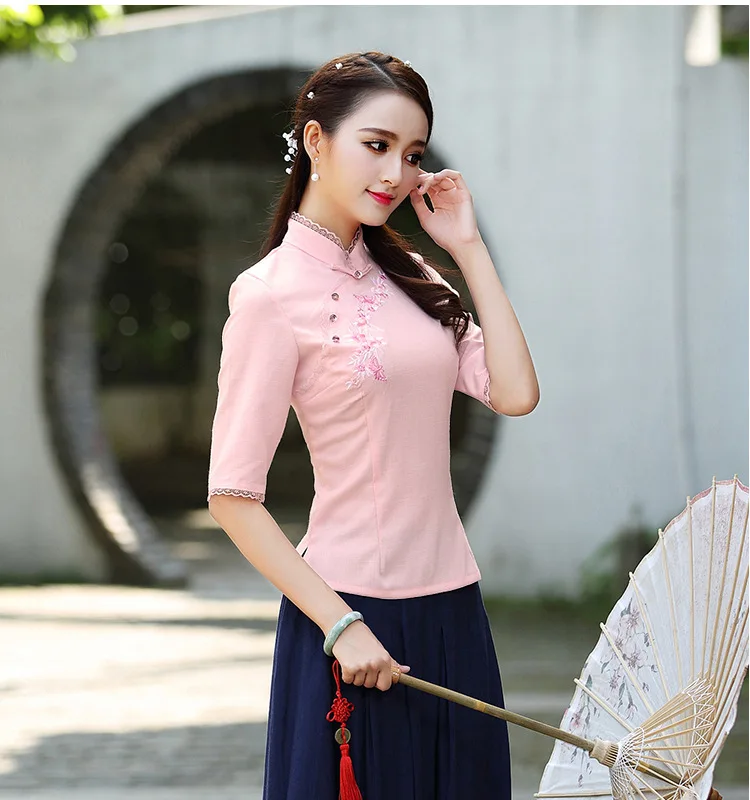 Винтажные рубашки в китайском студенческом стиле, китайская блуза Чонсам из хлопка и льна с вышивкой и кружевными рукавами |