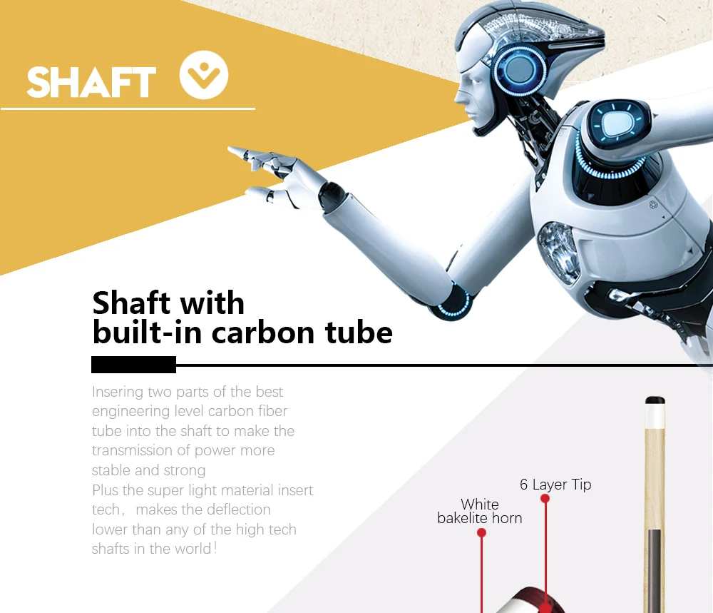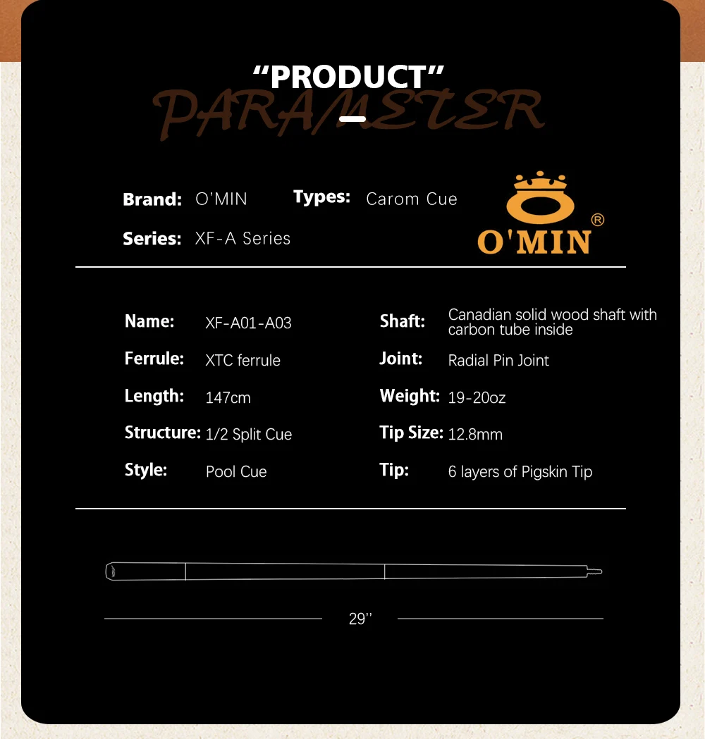 Название: XF-A01-A05 Наконечник: наконечник XTC Длина: 147 см Структура: 1/2 раздельный кий Стиль: бильярдный кий Вал: Канадский вал из цельного дерева с карбоновой трубкой внутри Шарнир: радиальный штыревой шарнир Вес: 19-20 унций Размер наконечника: 12,4-12,8 мм Совет: 6 слоев свиной кожи