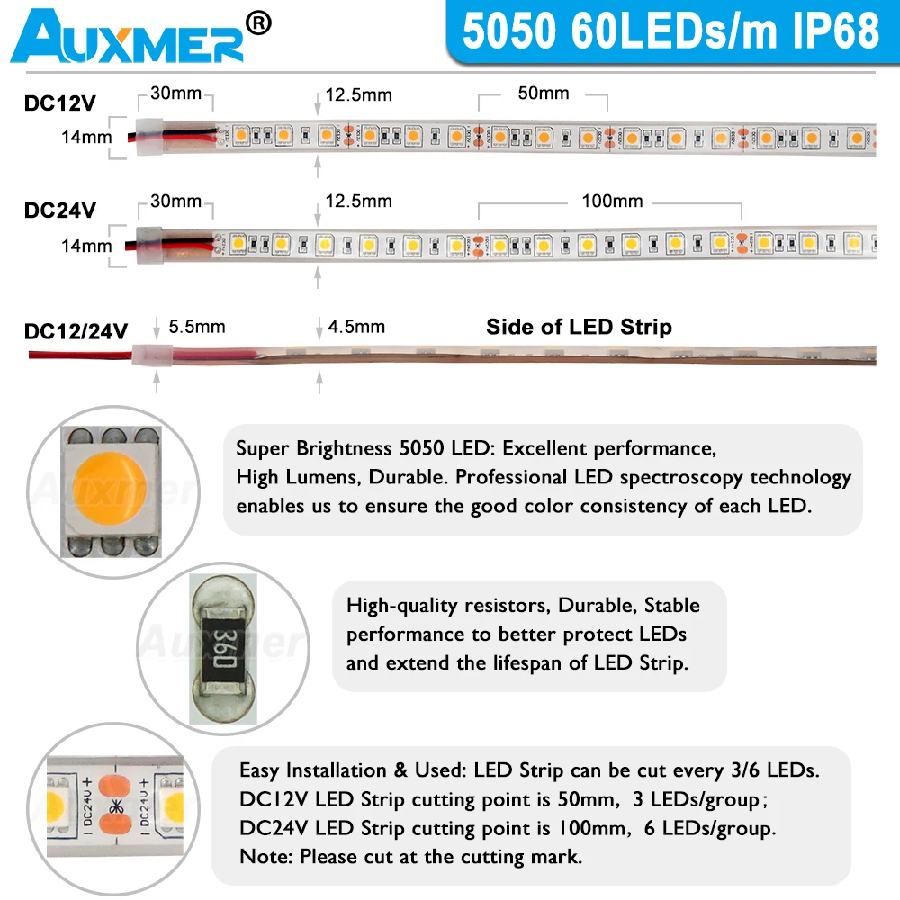 Auxmer такая же спецификация Светодиодная лента делится на входное напряжение DC12V и DC24V. Они имеют только различное входное напряжение. Но мощность, размер и эффективность работы одинаковы.