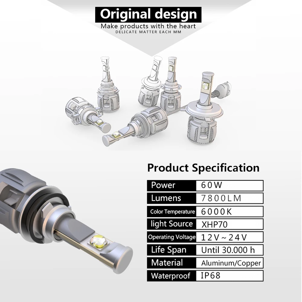 Номер модели: Одиночный луч: H1 H7 H8/H9/H11 9005/HB3 9006/HB4 9012/HIR2 D4C/D1S/D2S/D3S/D4S Двойной луч: H4/9003 9004 9007 H13 Характеристики: Светильник Soure: обновленный чип XHP 70 Мощность: 60 Вт каждая лампа, 120 Вт набор Люмены: 7800LM каждая лампа, 15600LM набор Цветовая температура: 6000K холодный белый Рабочее напряжение: 12-24 В постоянного тока Срок службы: до 5 лет Рабочая температура:-40 ℃-+ 100 ℃ Посылка: 2 * светодиодный фонарь 2 * Поставка привода