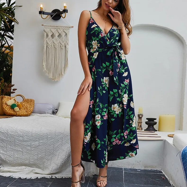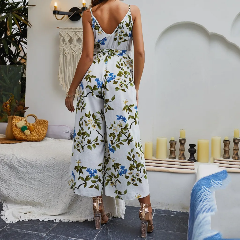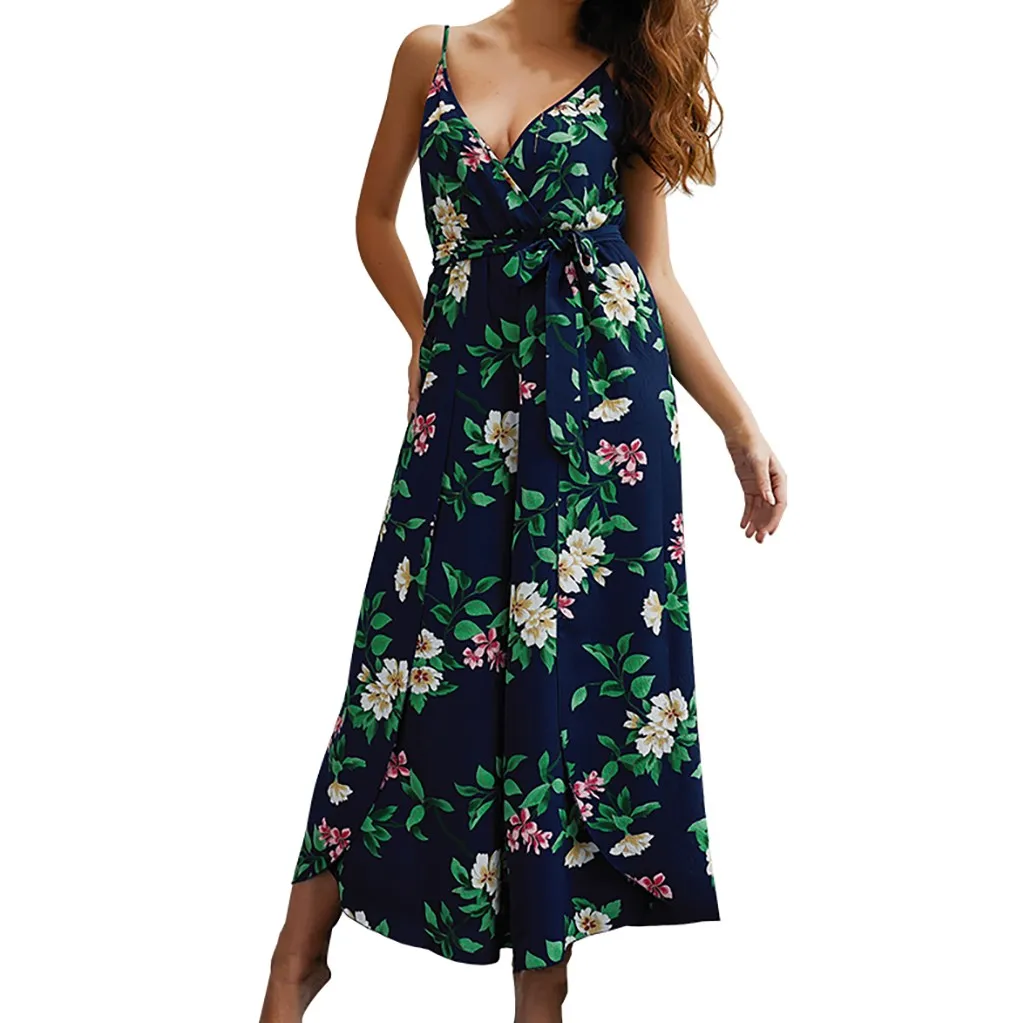 Женский Летний Пляжный сексуальный комбинезон без рукавов с цветочным принтом, комбинезон на бретелях