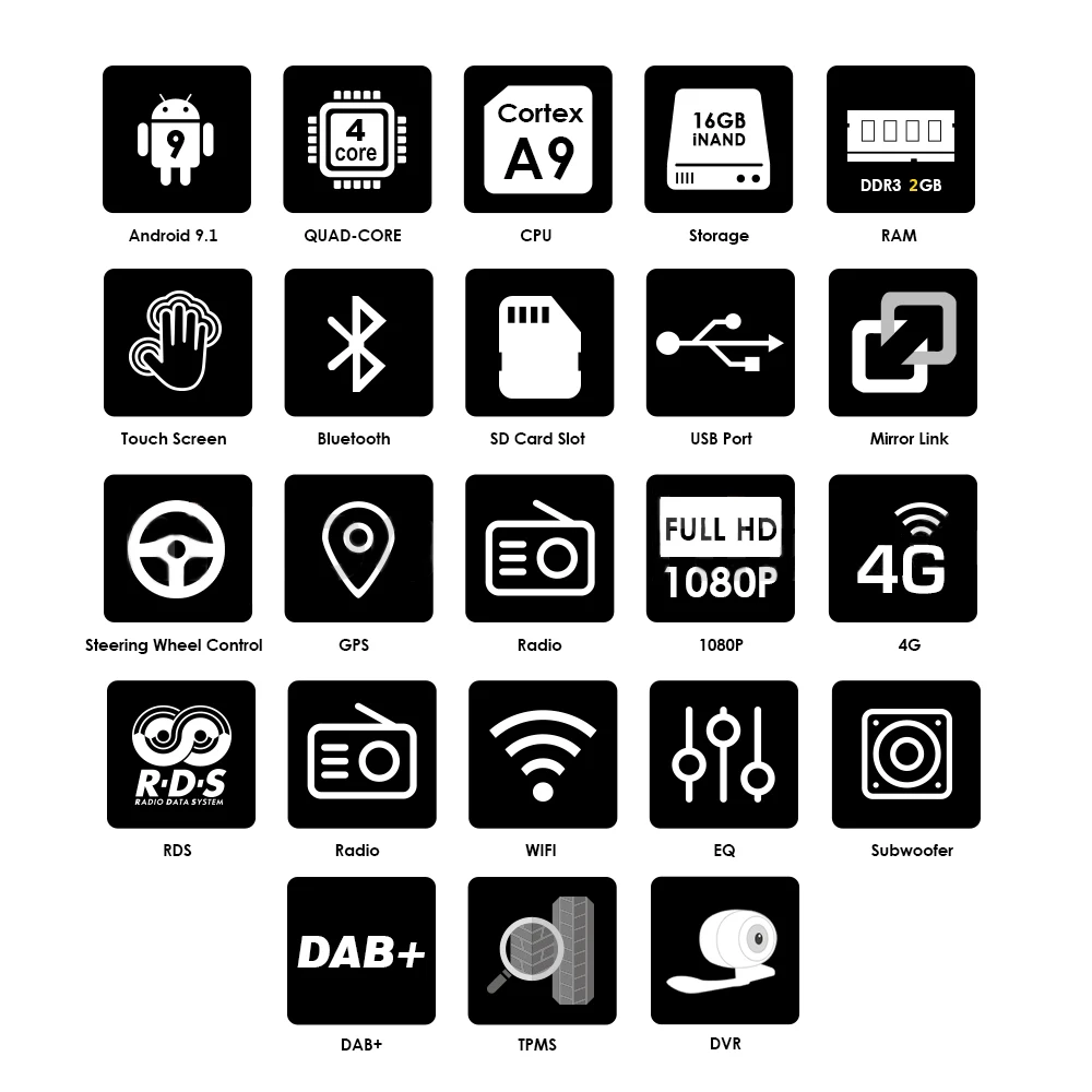 · 7 дюймовый сенсорный экран 1-DIN TFT, LCD, DVD-дисплей, · Разрешение экрана 1024x600 · Чипы ЦП: MTK MT8127 4 ядра · Основной процессор Freq. : 1,3 GMHz · Оперативная память: DDR3 2 ГБ · FLASH-память (внутренняя память): 16 ГБ · Встроенная 16G NandFlash память для музыки/данных навигационной карты/видео &Middot; Совместимость мультимедийного плеера со всеми форматами &Middot; AM/FM/R.D.S радио, автоматическое хранение памяти/предустановленное сканирование · FM частота: 87,5-108MH AM частота: 522-1620 кГц · Тип экрана: выдвигающийся ёмкостный сенсорный экран внутри радиоустройства. И съёмная передняя панель «противоугон». · Buit-in WiFi модуль: вы можете случайным образом conntect WiFi Интернет через Wi-Fi hotspot.4G мобильный телефон обмен сигнала через точку доступа WiFi. Вы также можете подключить сигнал Wi-Fi через ключ передачи данных с 3Gdoggle USB интерфейсом. &Middot; Сеть: GPS, BT, WiFi · Поддержка Mirror Link для смартфона · Двухзонная функция (пользователь может слушать музыку или радио в режиме gps-навигации) · Встроенный gps-приемник, с GPS антенной, совместимой с Waze/Navfree/Google Map и т. д. &Middot; Поддержка управления рулевым колесом &Middot; Совместимость мультимедийного плеера со всеми форматами &Middot; Источник питания: 12 В · Встроенный Hi Fi усилитель 4X45 Вт · Встроенный Bluetooth 4.0 с A2DP, функцией Hands Free, телефоннойкнигой · Предустановленные карты: Бесплатная загрузка карты (подарок) в зависимости от страны доставки покупателя по умолчанию. Также вы можете сообщить нам, какая карта вам нужна в качестве метки. · Поддержка Bluetooth, MP3-плеера (Внимание: Эта функция может работать, только если мобильный телефон поддерживает аудиовыход через Bluetooth) · Поддержка камеры заднего вида: стерео может автоматически переключаться на заднюю камеру при смене направления автомобиля · Поддержка 720P DVR вход, легко управлять DVR на экране дисплея.(DVR опционально, нужно купить DVR отдельно) · Формат видео: 3GP, AVI, WMV, M4V, MOV, MP4, MKV и т. д. · Формат Мультимедиа: MP3, M4A, WAV, OGG, OGA, AAC, MKA, MIDI, APE, FLAC, M3U, M3U8 и т. д. &Middot; Формат фото: JPG, JPEG, GIF, PNG, BMP, DIB · Язык: арабский немецкий греческий английский испанский персидский французский венгерский итальянский польский португальский румынский русский Тайский Турецкий украинский вьетнамский Китайский (Традиционный)