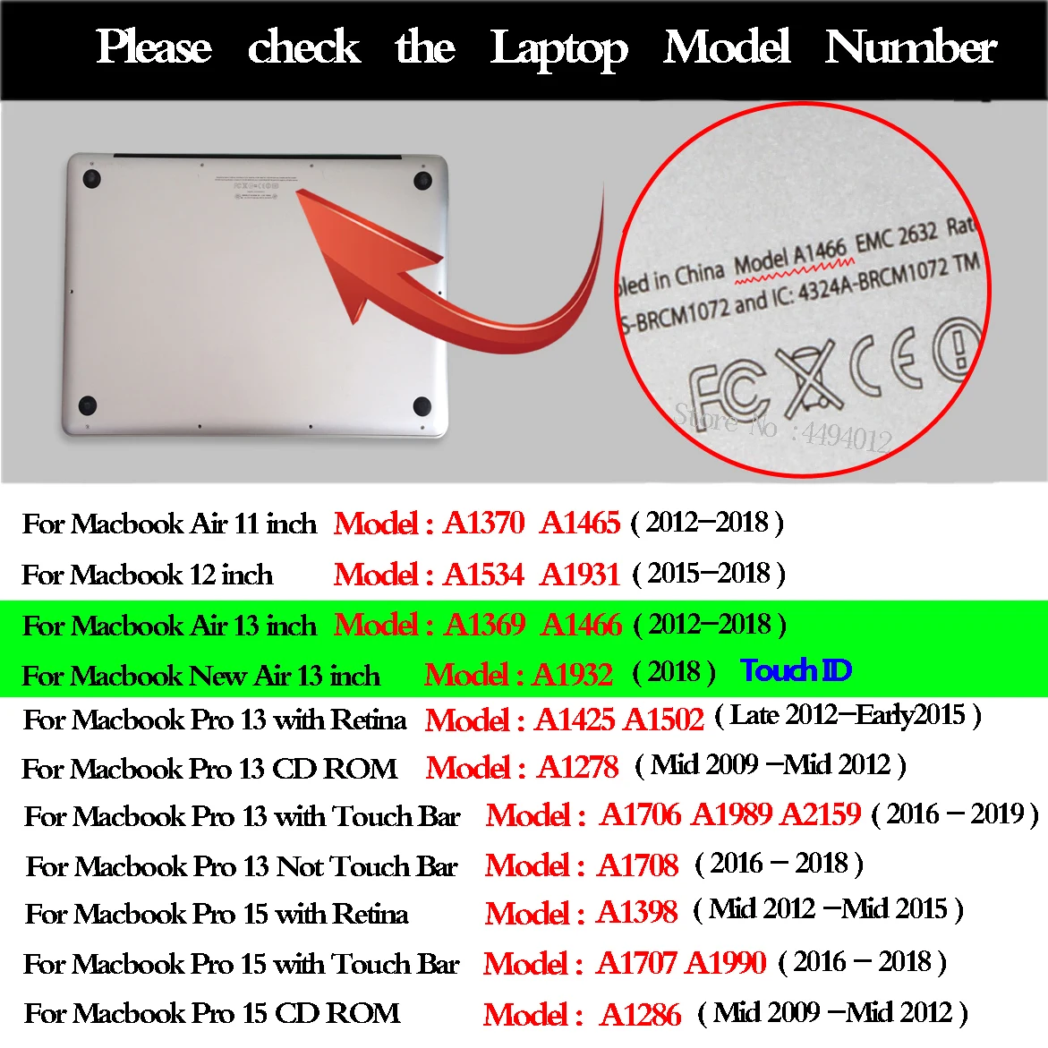 Если вы не уверены в размере, пожалуйста, проверьте заднюю часть вашего макбука, вы можете увидеть напечатанную там модель (Axxxx), И тогда вы можете выбрать подходящую обложку для вашего mcbook со следующей таблицей сравнения, или свяжитесь с нами, мы хотели бы помочь.