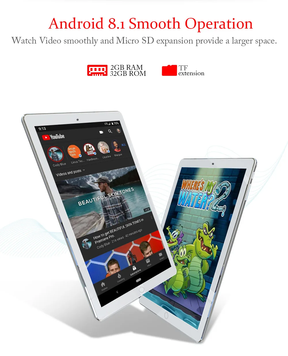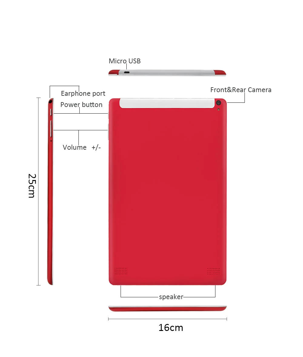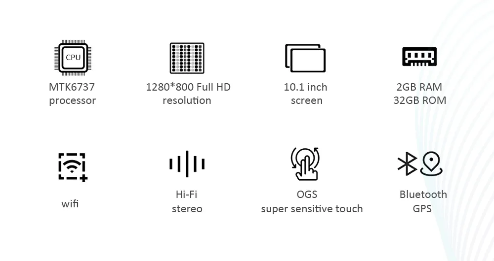 ЖК-дисплей: Диагональ экрана 10,1 дюймов IPS ЖК-дисплей ОС: Android 8,1 Сенсорная панель: сенсорный емкостный экран RAM:2G ROM:32G Bluetooth:v 4,0 WiFi:802.11b/g/n Мощность адаптер: 5V, 2A Батарея: 3,7 V/5000mha Цвет: черный/серебристый/красный Формат аудио файлов: MID, OGG, APE, WMA, WAV, MP3 Формат видеофайлов: WMV, RMVB, MPG, AVI, 3GP, MP4 Формат файла изображения: GIF, BMP, PNG, JPG Внешняя память: до 128 ГБ Внутренний: 32 ГБ (в системе Android используется часть памяти)