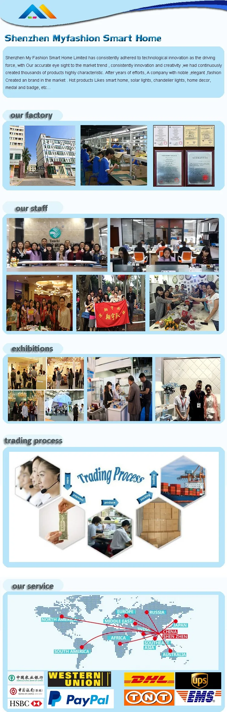 Мы,Шэньчжэнь My Fashion Smar Home & Lighting LTDОриентируйтесь на открытый Солнечный свет и освещение в помещении высокого качества, высокая производительность и высокий уровень ROI, строя долгосрочное сотрудничество друг с другом, не одноразовый бизнес.