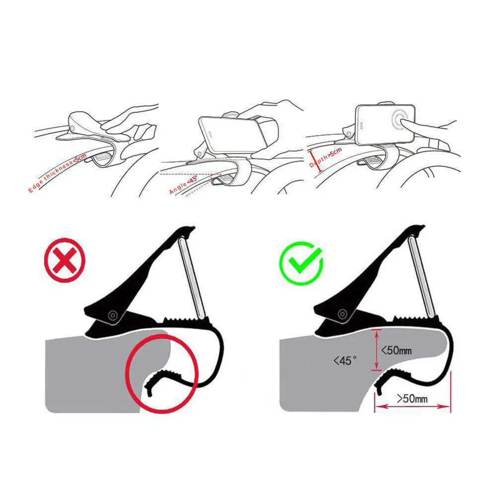 -Отверстия не должны превышать 40 мм. -Не помещайте на солнце длительное воздействие. -Пожалуйста, проверьте, что телефон правильно установлен перед вождением. -Если ваша верхняя панель слишком тонкая для захвата, вы можете добавить некоторую нескользящую прокладку между рукояткой, чтобы затянуть ее. -Не рекомендуется держать телефон шириной до 2 дюймов, потому что он легко отвалится.