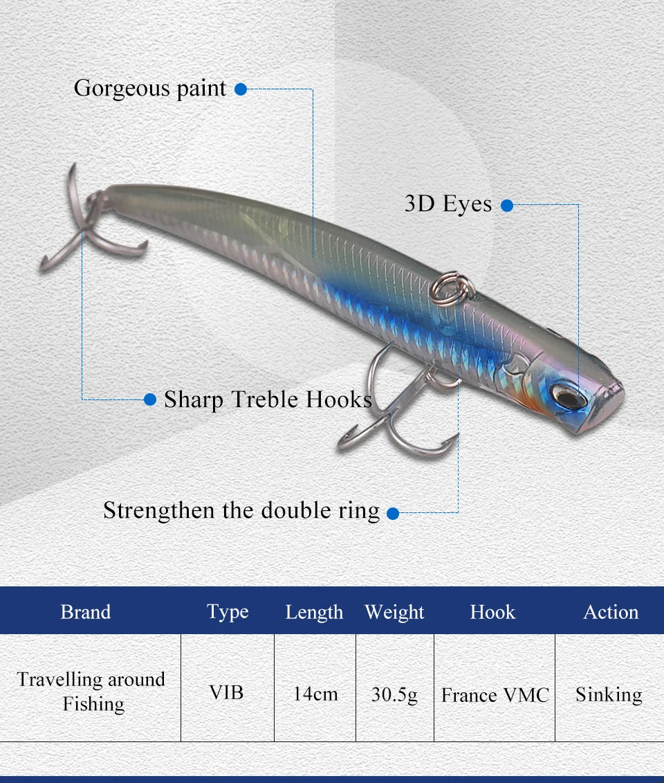 1. Бренд: путешествие вокруг рыбалки 2. Тип: жесткая приманка VIB 3. Цвет: 4 цвета s, как показано на рисунке, могут быть небольшие различия в цвете. 4. Длина: 14 см/шт. 5. Вес: 30,5 г/шт. 6. Действие: опускается на дно 7. Крючок: французские тройные Крючки VMC