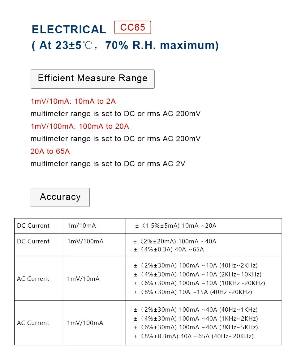 Диапазон эффективного измерения: от 20 мА до 65А постоянного тока