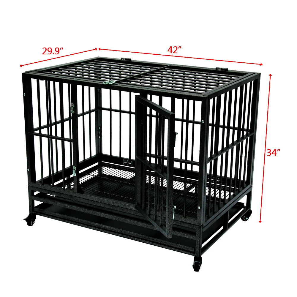 Это наша новая сверхпрочная прочная клетка для собак с колесом. Эта клетка разработана, в частности, с тяжелой стальной рамой, идеальный выбор для вас, чтобы держать ваших питомцев в безопасности и комфорте. Каждый стержень прочно сварен, чтобы обеспечить самую прочную конструкцию. Двухдверная конструкция с одной спереди и другой сверху обеспечивает легкий доступ к нашему питомцу. Вы можете поменять еду и воду для вашего питомца с входной двери. Когда вы хотите вынуть вашего питомца из клетки, дверь на верхней части будет работать. Передняя дверь имеет двойные защелки и верхнюю дверь с одной, которые достаточно прочны, чтобы защитить нашего питомца от побега. Решетчатый дизайн пола позволяет грязям опускаться на поднос ниже, сохранить чистую среду для домашних животных. Как решетчатый пол, так и стальной поддон легко выскальзывают из дна для легкой и удобной очистки. Кроме того, клетка оснащена четырьмя роликами для легкого перемещения и два из них имеют запираемый дизайн, чтобы избежать случайного перемещения.