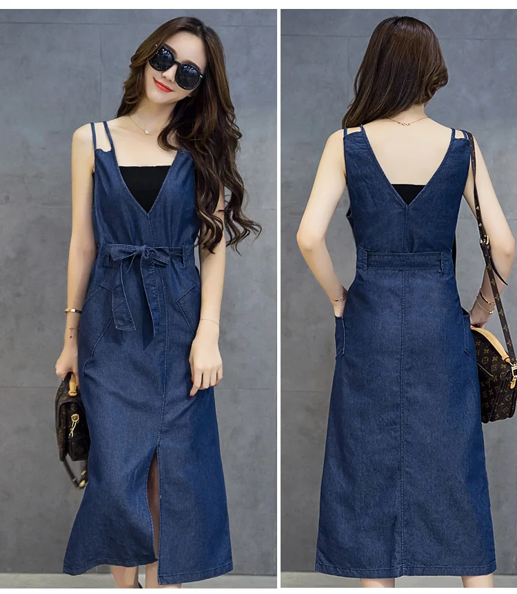 Джинсовый сарафан длинное джинсовое платье джинсовая одежда женское синее платье миди на бретелях с разрезом и поясом Бандажное летнее платье vestido QC149