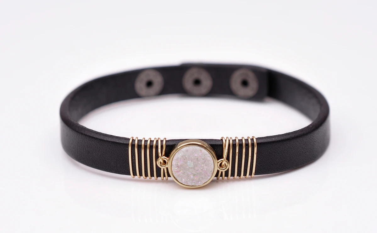 Натуральный Druzy драгоценный камень ручной работы кожаный браслет манжета браслет мужские женскиеОтборные материалы, кожа, которую мы используем, является европейской, итальянская воловья кожа. Кожа мягкая, прочная, текстура нежная. После бедственного процесса, есть естественное чувство моды, классический и не устарел. Потому что это ручная работа, каждый браслет выглядит по-разному и уникален для ваших собственных модных аксессуаров. Края обработаны очень хорошо и нет дискомфорта при соприкосновении с кожей. Толщина 3 мм делает браслет более модным на руке.
