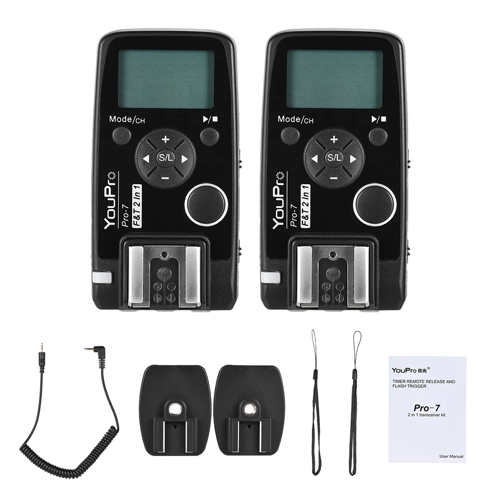 Поддержка беспроводного триггера flash, интегрированный трансивер. Поддержка беспроводного/проводного дистанционного управления затвором. С функцией беспроводного спуска затвора. Особенности: Беспроводная система дистанционного управления затвором FSK 2,4 ГГц может быть более эффективным, чтобы гарантировать скорость, расстояние и устойчивость. Расстояние дистанционного управления может достигать 100 м в емких зонах. Комплект беспроводного триггера flash Pro-7 состоит из двух таких же трансиверов. Он может быть настроен на одно состояние передачи (TX), что будет более удобным для тестирования flash, и может быть настроен на состояние трансивера (RX), автоматическое переключение режима передачи и приема, принимает функцию фокуса и затвора в состоянии «TX» и «RX», соответственно. Комплект Pro-7 имеет триггер и Таймер спуска затвора, два режима, может быть переключен кнопкой. Также есть экран с высоким разрешением, простой в управлении через экран. В режиме триггера flash: трансмиттер поддерживает запуск с одним контактом, поддерживает беспроводное включение и запуск вспышки через горячий башмак камеры, с кабелем синхронизации ПК может быть триггером студийных ламп и групп вспышек. Максимальная скорость синхронизации flash sync до 1/320 с (некоторые модели могут достигать только 1/250 с или меньше, различные комбинации моделей flash и камер могут достигать различной скорости синхронизации flash). С 7 групп A/B/C и 32 каналами. Режим дистанционного спуска затвора: Подключите другой кабель для работы с проводным/беспроводным, поддерживает одинарную, непрерывную, лампу, съемку с задержкой и режим планирования таймера съемки. Поставляется с кабелем синхронизации E3 для камер Canon 80D 77D 800D 760D 750D 700D 650D 600D 550D/ Rebel T2i T3i T4i T5i T6i T6S T7i 1300D 1200D 1100D 70D 60D. Технические характеристики: Бренд: YouPro Модель: Pro-7 Модель кабеля для синхронизации ПК: E3 Тип: Беспроводная система дистанционного управления FSK 2,4 ГГц Дальность передачи: 100 метров Каналы: 32 Спуск затвора: полунажатие, полный пресс Интерфейс затвора: разъем 2,5 мм Студийный флэш-светильник: стандартный разъем для ПК Максимальная скорость синхронизации: 1/320 с Питание: всего 4 аккумулятора AAA (не входят в комплект) Время работы в режиме ожидания: около 400 часов в штате Техас, около 45 часов в режиме RX Размер изделия (1 шт.): 8,4*4,4*4,05 см/3,3*1,7*1,6 дюйма Вес изделия (1 шт.): 64 г/2,3 унции Размер посылка: 12,8*10*5,1 см/5*3,9*2 дюйма Вес посылка: 221 г/7,8 унции Посылка-лист: 1 комплект приемопередатчика 1 * E3 2,5 мм пк кабель синхронизации и затвора 1 * Руководство пользователя (английский и китайский) Примечание: Камера в комплект не входит.