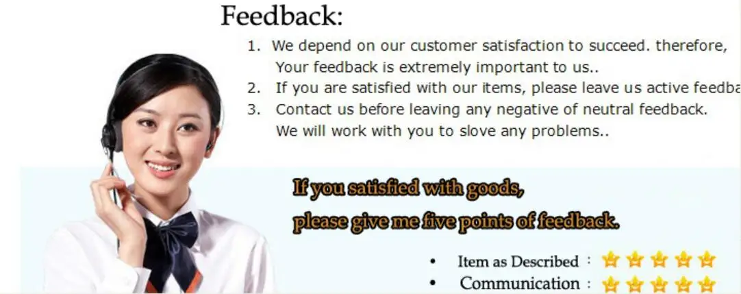 Доставка: Доставка будет организована в течение 2 рабочих дней после подтверждения оплаты, если информация о покупателе и адрес доставки будут подтверждены. Пожалуйста, укажите правильный почтовый индекс и действительный номер телефона, чтобы избежать задержки доставки. Плата за удаленную область исключена, для адресов, перечисленных в отдаленных районах на веб-сайте DHL/UPS, будет взиматься дополнительная $25 США. Налог на импорт: Мы не несем ответственности за любые таможенные пошлины или налог на импорт, взимаемый таможней. Мы отметим, что стоимость товара составляет 8 долларов США на посылке, это значение предназначено только для таможенной декларации. Если у вас есть особые пожелания по заявленной стоимости, пожалуйста, дайте нам знать, мы сделаем все возможное, чтобы удовлетворить ваши потребности. Возврат и гарантия. Для всех продуктов в нашем магазине, мы предложим один год гарантии для них. Это означает, что с момента размещения заказа в течение одного года, если что-то не так с продукцией (при нормальном использовании, конечно), мы сделаем все возможное, чтобы помочь вам решить проблему. Например, вы покупаете dvd-проигрыватель в нашем магазине, и после полугода использования он идет не так, и после разговора с нами вы не можете решить проблему самостоятельно, вы можете выбрать, чтобы отправить обратно к нам, и мы поможем отремонтировать его, тогда мы повторно его к вам. Что касается этой процедуры, то стоимость доставки производится. Вы будете нести ответственность за стоимость доставки возврата, и мы отправим его вам по нашей цене. Отзывы: Отзывы очень важны для каждого магазина, продающего онлайн. Мы надеемся, что наши покупатели свяжутся с нами, прежде чем оставлять отрицательный/нейтральный отзывы. Пожалуйста, дайте нам знать о проблеме продукта, чтобы мы могли заработать oppotunity, чтобы сделать все возможное, чтобы помочь решить проблему. Мы уверены, что предложим хорошее решение вашей проблемы.