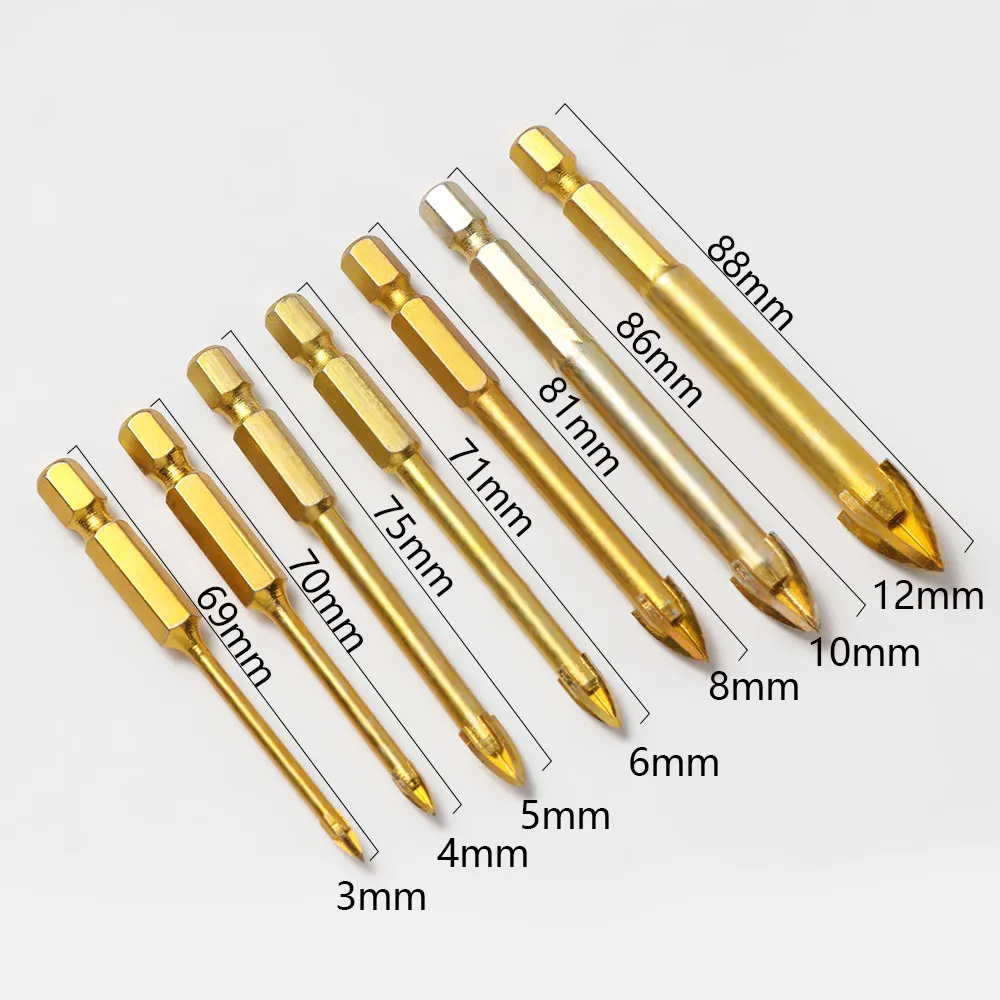 Отделка поверхности: с титановым покрытием Материал: титан, вольфрам Цвет: как на картинке Использование: сверление каменной кладки Тип: шестигранный хвостовик с наконечником из карбида вольфрама Длина: 69 мм, 70 мм, 75 мм, 77 мм, 81 мм, 86 мм, 88 мм Размер: 3 мм, 4 мм, 5 мм, 6 мм, 8 мм, 10 мм, 12 мм Количество: 1 шт.