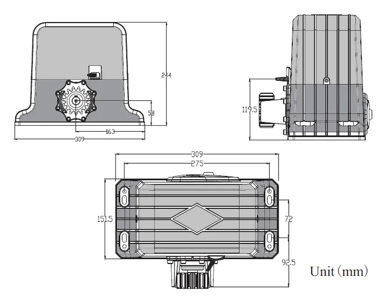 Это совершенно новый дизайн оператора раздвижных ворот, со всеми функциями и безопасностью дверей openers.br и-новая структура сцепления, модный внешний дизайн и совершенно новый метод управления, что делает двигатель более гуманистичным. Кроме того, интегрированный электромеханический дизайн и обтекаемый внешний вид также делают наш продукт более модным и элегантным.