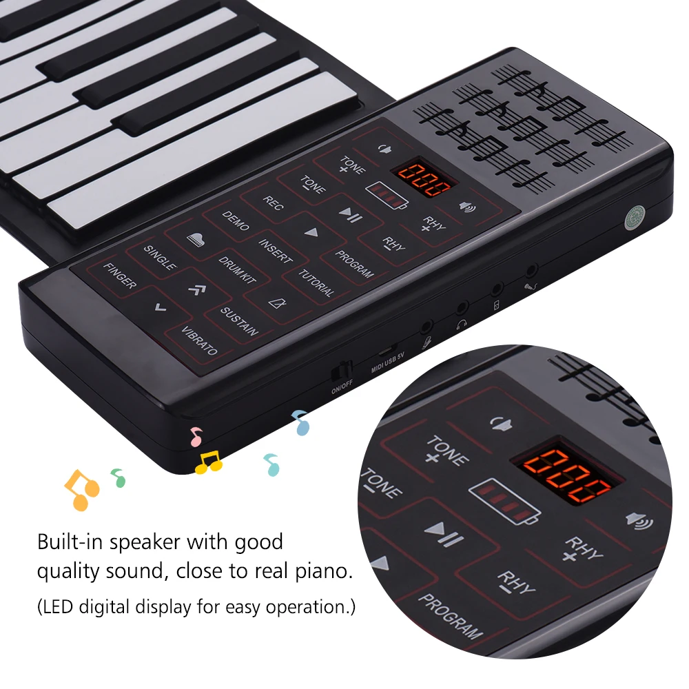 Гибкий свернутый дизайн и портативный размер позволяют легко играть на пианино в любое время и в любом месте.