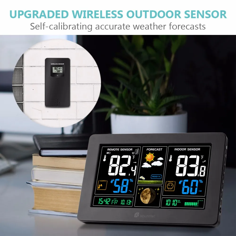 Инновационный наружный беспроводной датчик с наружным дисплеем температуры и влажности, гарантирует самокалибровку и точные данные о наружных условиях. 200 футов/60 м наружное расстояние передачи передатчика. Будьте готовы к дню, не выходя из передней двери.