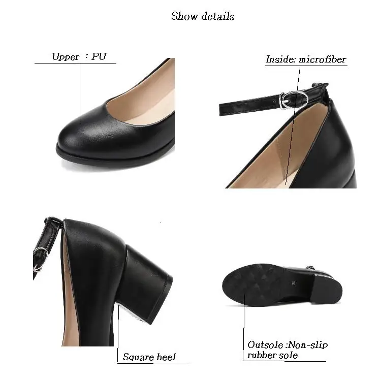 Материал верха: мягкий полиуретан. Внутренние материалы: микрофибра. Подошва: Нескользящая резина. Тип каблука: квадратный каблук. Высота каблука: 6 см Закрытый способ: ремешок с пряжкой. Цвет: коричневый, черный. Китайский размер: 34-45.