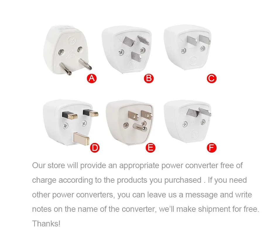 Наша продукция является европейской вилкой, пожалуйста, убедитесь, что она подходит для вашей страны или нет! Если нет, пожалуйста, забудьте оставить нам сообщение, сообщите мне, какой из них вам нужен, я могу отправить вам конвертировать Штепсель бесплатно! Спасибо!