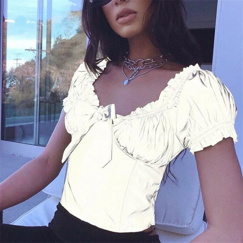 Модные женские Светоотражающие футболки, летняя футболка с круглым вырезом и бантом, с рукавами-фонариками, серые сексуальные повседневные светящиеся топы, 2019