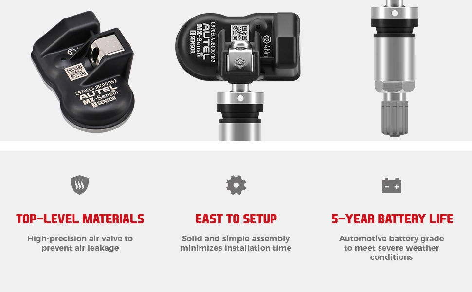 98% покрытие Благодаря последнему и наиболее комплексному охвату 98% OE датчиков на рынке, и до 90% североамериканских, европейских и азиатских транспортных средств, он почти подходит для всех типов колес на дороге. Легко Применение Максимальная сила сигнала датчика позволяет легко программировать датчики по беспроводной сети, даже когда они уже установлены на колесо. Кроме того, уникальная конструкция клапана с пресс-релизом делает замену ручного датчика намного проще. Твердая и прочная Оснащен автомобильным аккумулятором, сменным стержнем клапана из алюминия/резины, который выдерживает холодную, горячую и стойкую коррозию, и высокоточным воздушным клапаном для предотвращения утечки воздуха, этот датчик обеспечивает превосходную стабильность и производительность. Гарантия Autel гарантирует, что датчик не имеет материала и дефектов производства в течение 24 месяцев или 24000 миль. Каждый датчик отмечен серийным номером для отслеживания качества датчика с завода, чтобы гарантировать, что установлены только высококачественные детали.