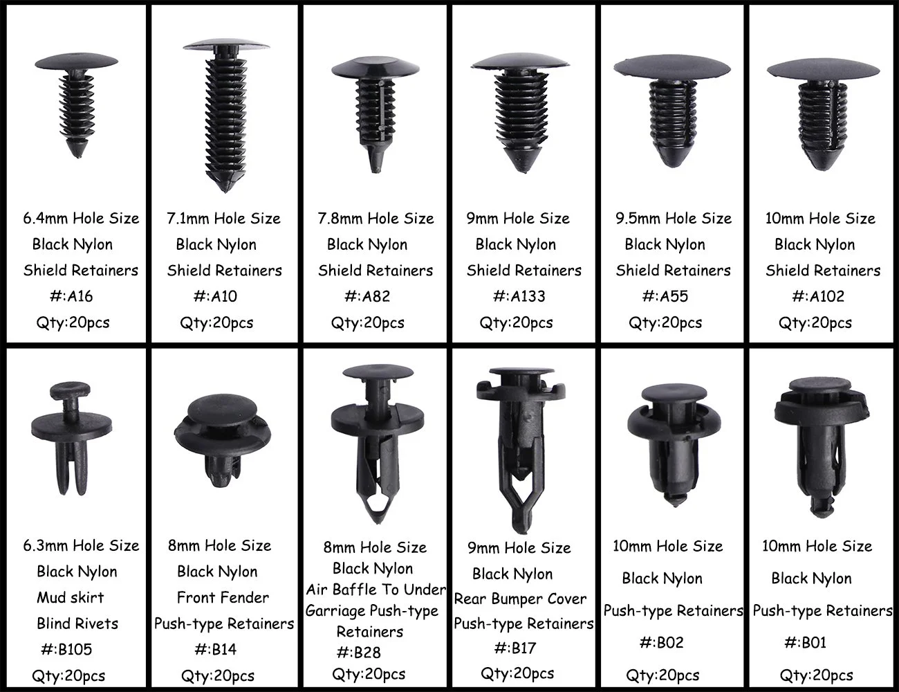 Особенности: ● Набор фиксаторов пуш-типа поставляется с красивой пластиковой коробкой для облегчения выбора типа фиксатора, который вы хотите использовать. ● Экономьте время и деньги. Нет необходимости ходить в магазин автозапчастей и искать различные крепежи. У нас есть их в коробке для того, что вам нужно. ● Не нужно беспокоиться о потере или повреждении крепежных деталей. Все необходимые фиксаторы для точной замены старых и сломанных фиксаторов. ● Посылка содержит: 240 шт. Автомобильный Набор фиксаторов типа Push (12 различных размеров) с красивым пластиковым ящиком для хранения. ● Отсеки для коробок с подробными списками размеров и количественных параметров. 12 видов зажимов. Посылка включает в себя: ● Размер отверстия A16 (6,4 мм); Диапазон панелей: .095 "-.540"-черные нейлоновые защитные фиксаторы-Кол-во: 20 ● Размер отверстия A10 (7,1 мм); Диапазон панелей: .125 "-.310"-черные нейлоновые защитные фиксаторы-Кол-во: 20 ● Размер отверстия A82 (7,8 мм); Диапазон панелей: .078 "-.490"-черные нейлоновые защитные фиксаторы-Кол-во: 20 ● Размер отверстия A133 (9 мм); Диапазон панелей: .060 "-.510"-черные нейлоновые защитные фиксаторы-Кол-во: 20 ● Размер отверстия A55 (9,5 мм); Диапазон панелей: .115 "-.565"-черные нейлоновые защитные фиксаторы-Кол-во: 20 ● Размер отверстия A102 (10 мм); Диапазон панелей: .040 "-.787"-черные нейлоновые защитные фиксаторы-Кол-во: 20 ● Размер отверстия B105 (6,3 мм); Диапазон панелей: 9/16 "-черная нейлоновая грязевая юбка с заклепками-Кол-во: 20 ● B14 (8 мм) Размер отверстия; Диаметр головки: 20 мм, длина штока: 11 мм-черный нейлон переднее крыло нажимного типа фиксаторы-Кол-во: 20 ● Размер отверстия B28 (8 мм); Диаметр головки: 20 мм, длина штока: 20 мм-черный нейлоновый воздушный перегородка для фиксаторов типа push-type-Кол-во: 20 ● B17 (9 мм) Размер отверстия; Диаметр головки: 18 мм-длина штока: 28 мм-черный нейлоновый задний бампер крышка нажимного типа фиксаторы-Кол-во: 20 ● B02 (10 мм) Размер отверстия; Диаметр головки: 20 мм-длина штока: 13 мм-черные нейлоновые фиксаторы пуш-типа-Кол-во: 20 ● B01 (10 мм) Размер отверстия; Диаметр головки: 20 мм-длина штока: 18 мм-черные нейлоновые фиксаторы пуш-типа-Кол-во: 20