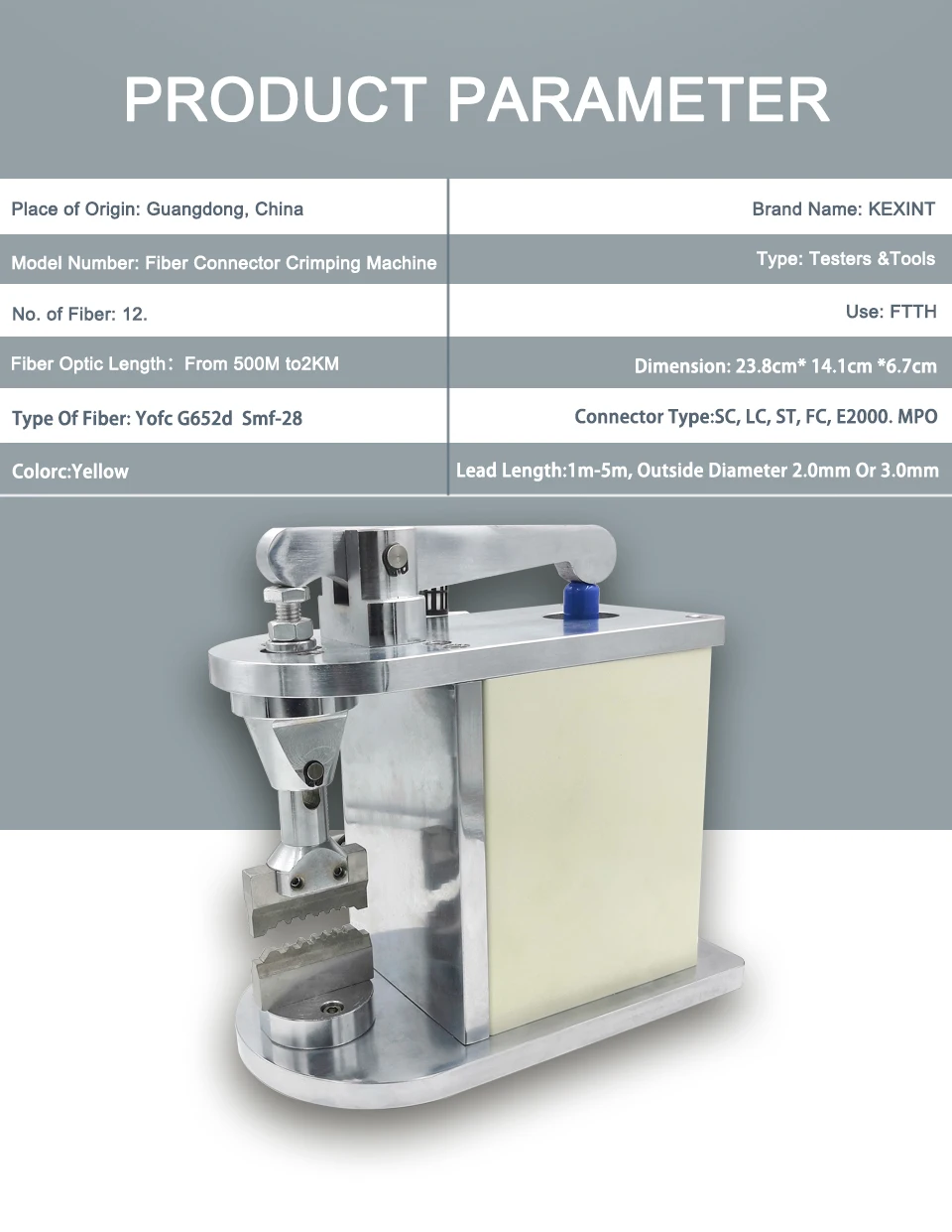 1. Предназначен для обжима и сборки оптоволоконных соединителей 2. Прецизионный шестигранный размер для обжимной матрицы для 3.Applicalbe к разъемам SC/FC/E2000/MU/LC 4. Предоставляем Опциональные MPO обжимные штампы