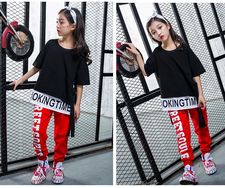Детская одежда в стиле хип-хоп танцевальный костюм для девочек, свободная футболка большого размера Топ, штаны для бега одежда для бальных танцев в стиле джаз, уличная одежда