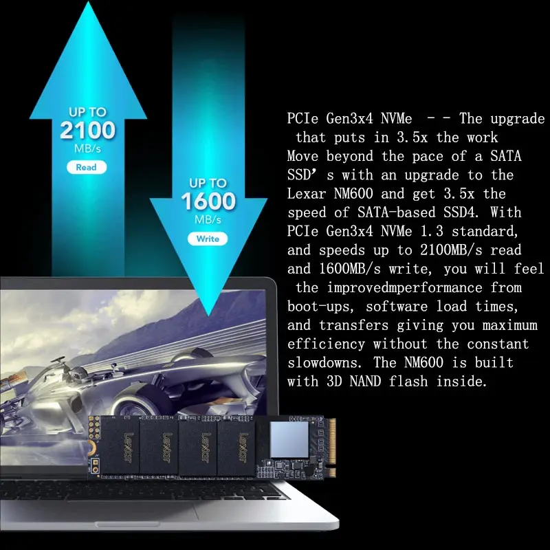 2. PCIe Gen3x4 NVMe-обновление, которое кладет в 3.5x работу Переходите за рамки SATA SSD с обновлением к Lexar NM600 и получите 3.5x скорость SSD4. С PCIe Gen3x4 NVMe 1,3 стандарт, и со скоростью до 2100 МБ/с. читать и 1600 МБ/с. записи, вы будете чувствовать себя в улучшенными характеристиками от загрузки закатанными штанинами, программное обеспечение время загрузки сайта, и передача дает вам максимальную эффективность без постоянного замедления. NM600 встроен с 3D NAND flash внутри.