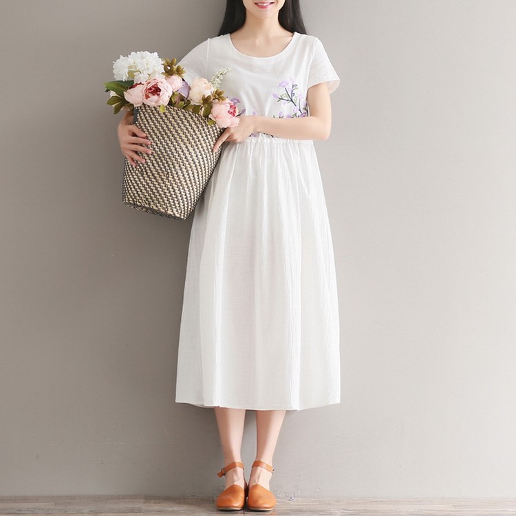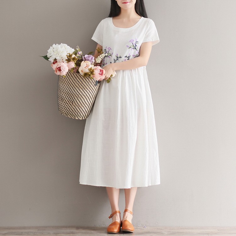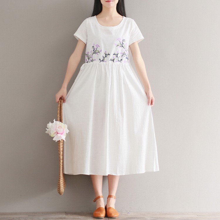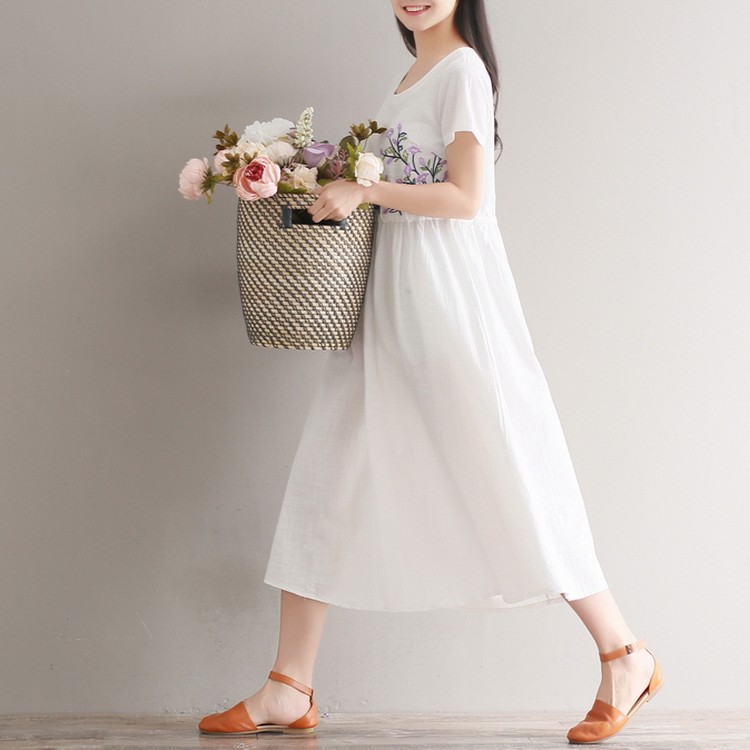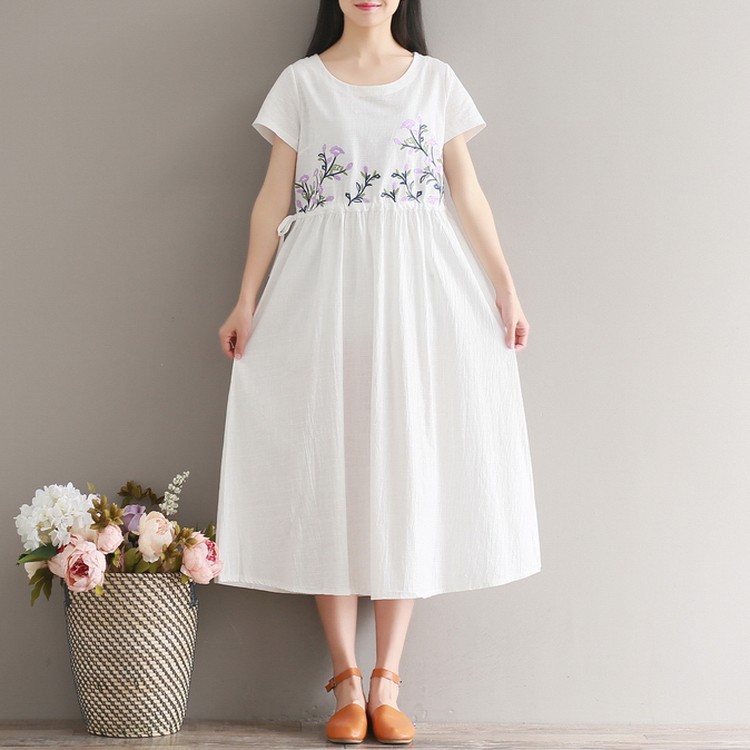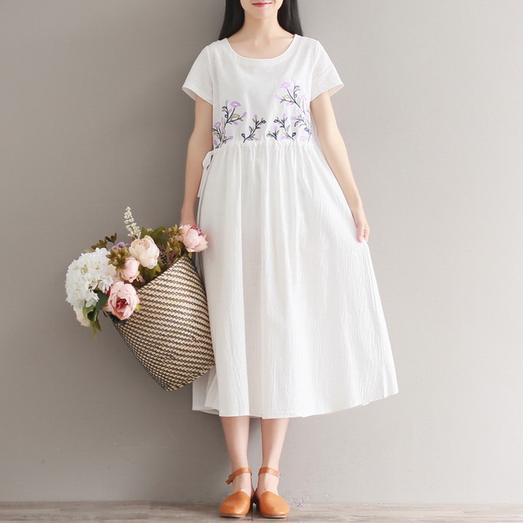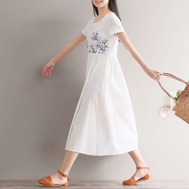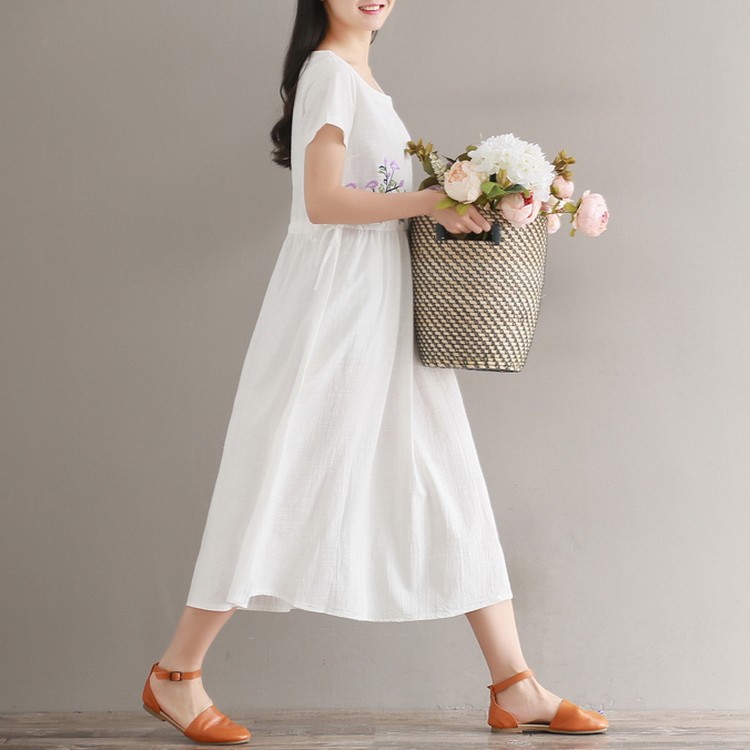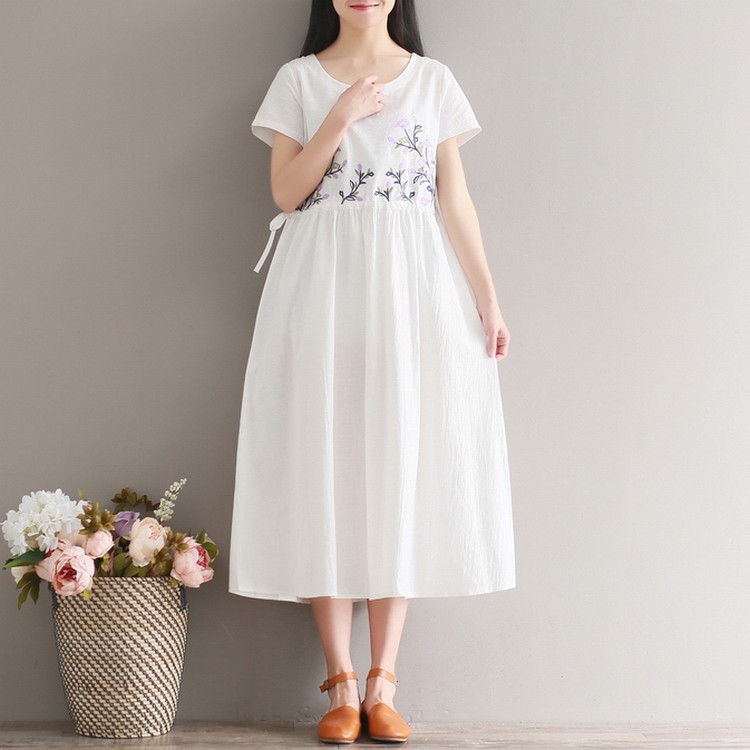 Женское пляжное платье из хлопка и льна, белое Повседневное платье с цветочной вышивкой, QV803, лето 2019