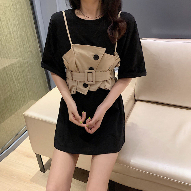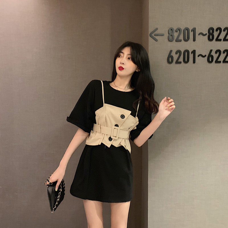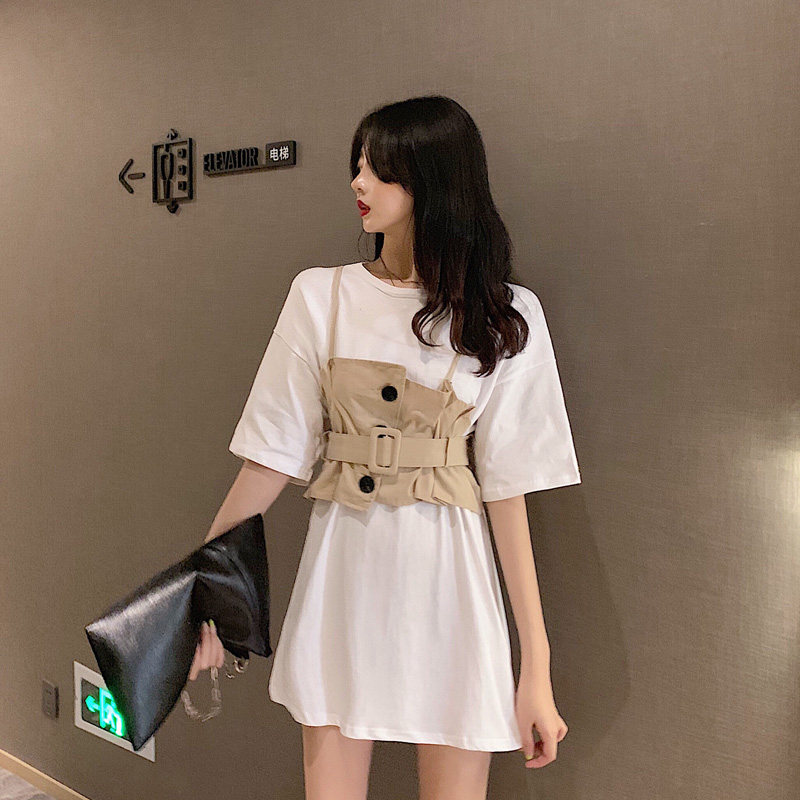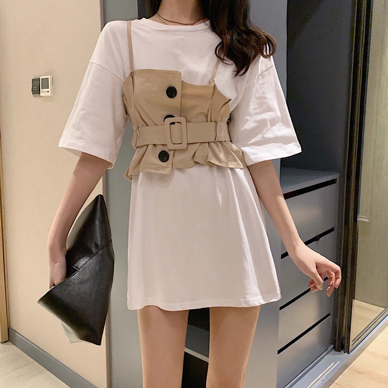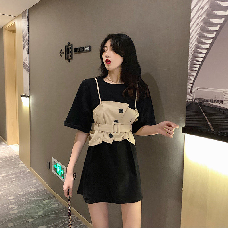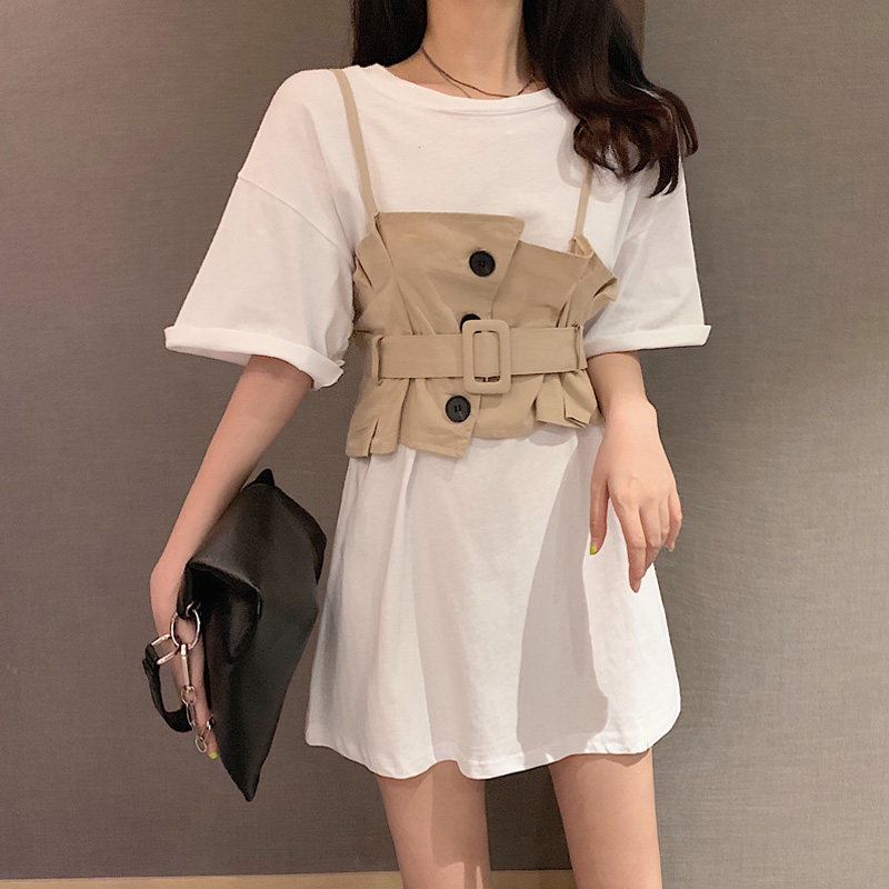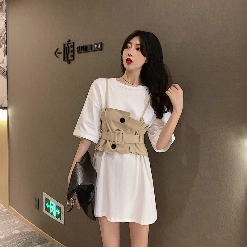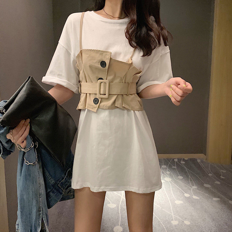 2 цвета, летнее платье 2019, повседневное свободное платье-футболка с коротким рукавом, мини Vestidos Feminino + жилет, комплект из 2 предметов, женское платье