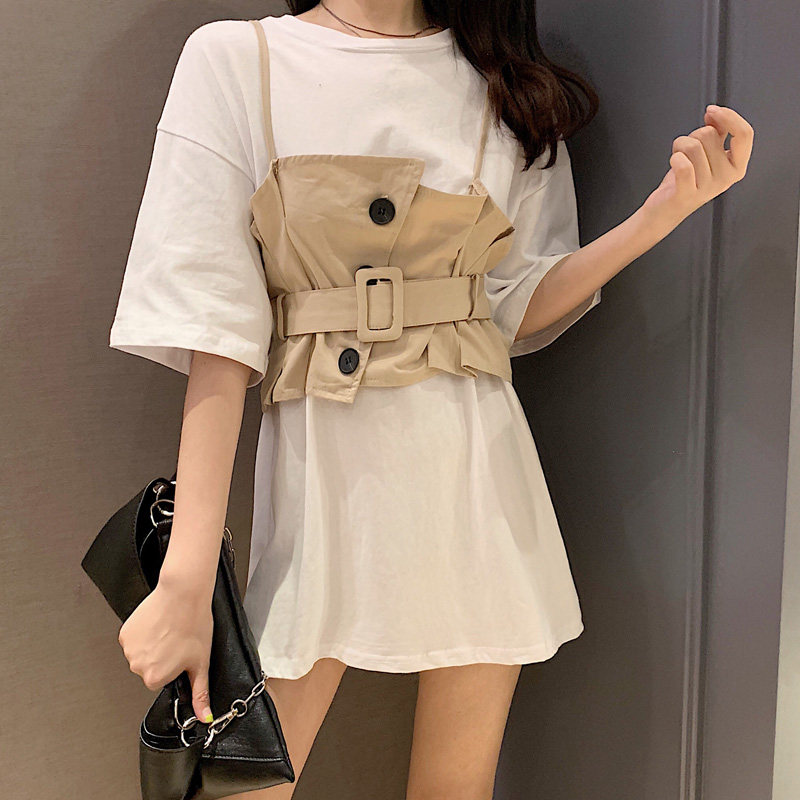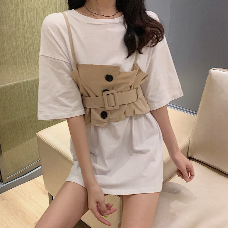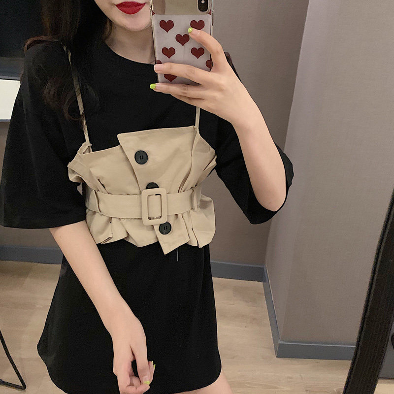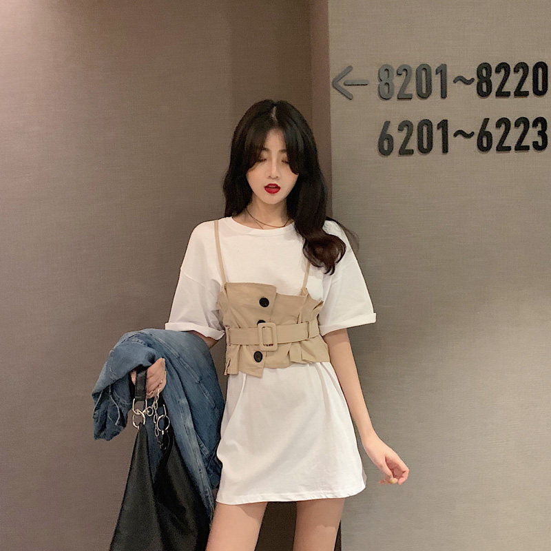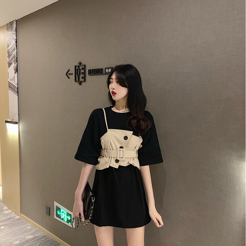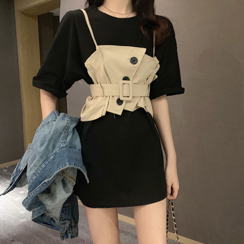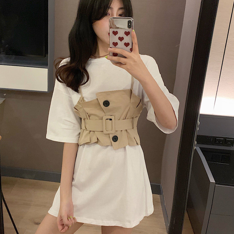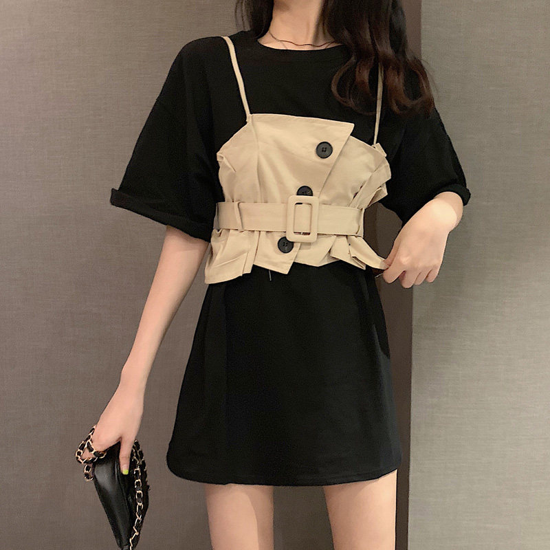 2 цвета, летнее платье 2019, повседневное свободное платье-футболка с коротким рукавом, мини Vestidos Feminino + жилет, комплект из 2 предметов, женское платье