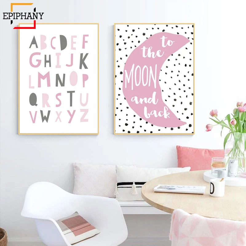 Детская парусиновая картина для девочек с розовым алфавитом, принтом кролика, Скандинавская настенная живопись, плакаты и принты, мультяшная картина для детской комнаты, Декор