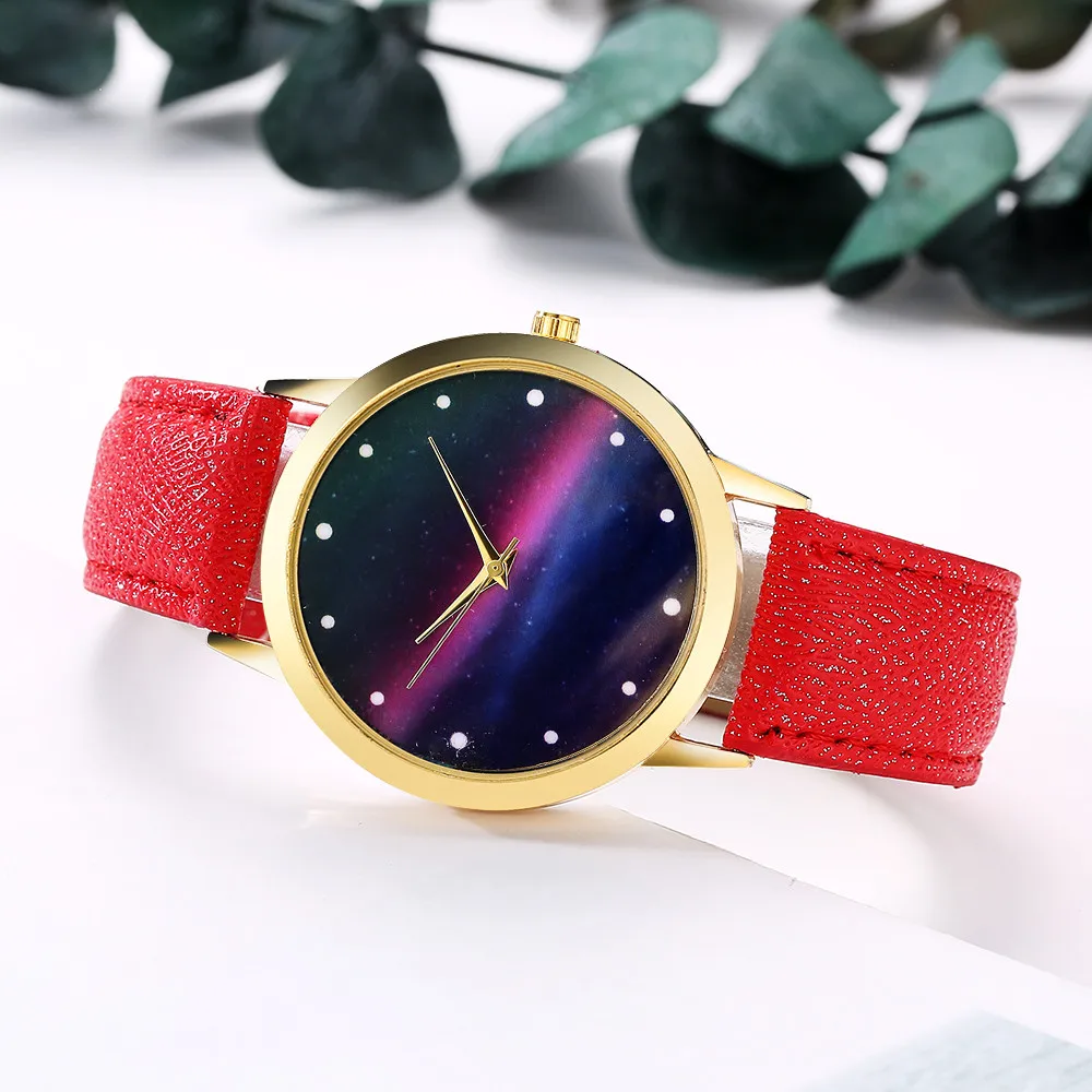 Женская мода Звездное небо кожаный ремешок аналоговые кварцевые круглые наручные часы