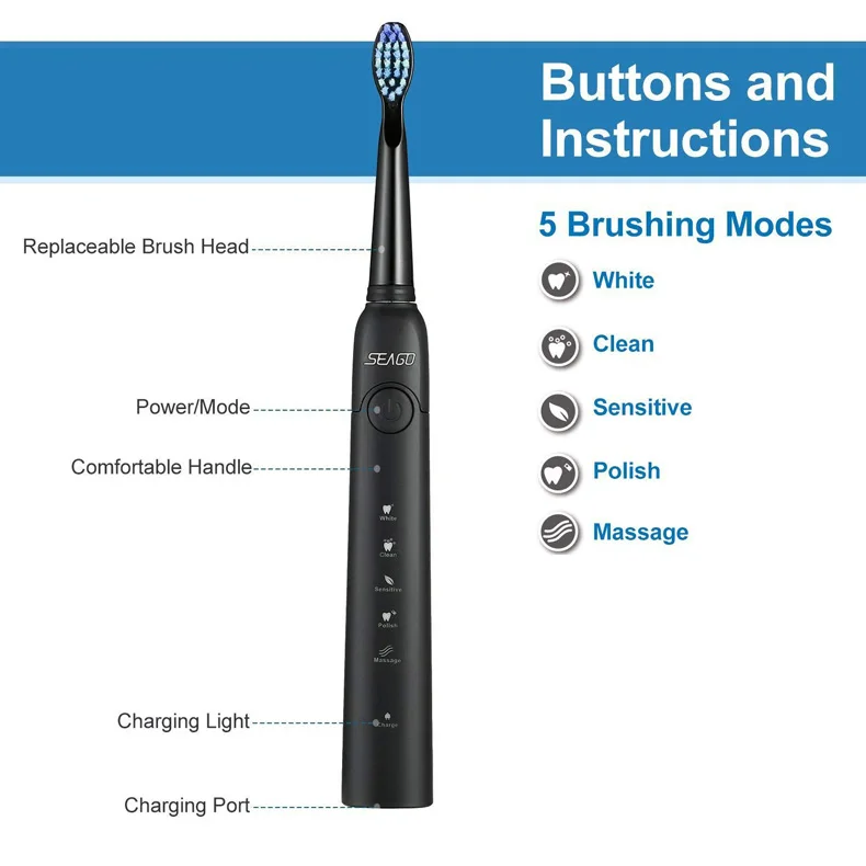 Больше продуктов может вам понравиться Seago 507 электрическая зубная щетка для взрослых умный таймер 40000 ударов Глубокая чистка полости рта 5 режимов USB перезаряжаемая автоматическая зубная щетка Информация о товаре: -Концевая закругленная нейлоновая щетина DuPont, мягкая и удобная, полированная для износостойкой очистки,Мягко и эффективно достигает глубины между зубами и вдоль резинки Линия -5 режимов чистки белого, чистого, чувствительного, Полировка и массаж для удовлетворения различных потребностей в уходе за полостью рта,Звуковой Вибрационный 40000 ударов в минуту, удалите налет. -2 минут смарт-таймер с 30 секунд интервал, чтобы поощрить стоматолог-рекомендуется чистить привычки? USB зарядка с индикаторным светильник, легкий и удобный для использования дома или в путешествиях -Водонепроницаемый IPX5, Полностью моющийся, но не замачивайте его в воде и всегда убедитесь, что чехол USB правильно запечатан.Поставляется с двумя сменными головками кистей -Полная зарядка обеспечивает 30 дней чистки.Не предназначено для детей в возрасте до трех лет 1 × Ручка кисти 3 × сменные головки кистей 1 взаимный обмен данными между компьютером и периферийными устройствами зарядное устройство