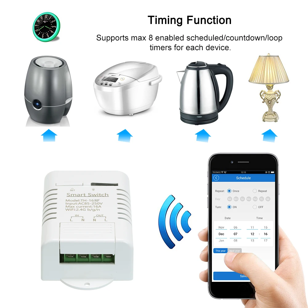 Этот товар является универсальным переключателем для вашей системы умного дома, чтобы удаленно и автоматически включать/выключать любые приборы с помощью приложения для телефона. Когда температура окружающей среды попадает в диапазон, она автоматически включится или выключится подключенные устройства. Он также поддерживает время включения/выключения приборов и поддерживает предустановку диапазона температуры. Он оснащен модулем радиочастотного приемника 433 МГц внутри, который может использоваться вместе с пультом дистанционного управления RF и позволяет управлять бытовыми приборами без приложения для телефона. Работайте с TH-16 RF Smart Switch, вы можете сделать свой дом умнее.