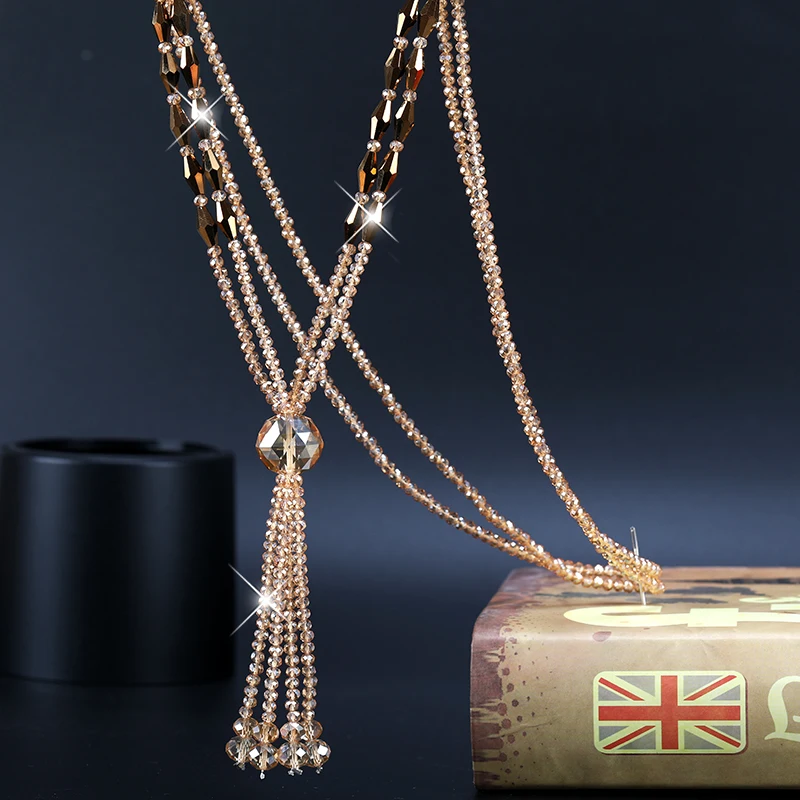 Бохо Изящные блестящие хрустальные длинные бусы с кисточкой ожерелье