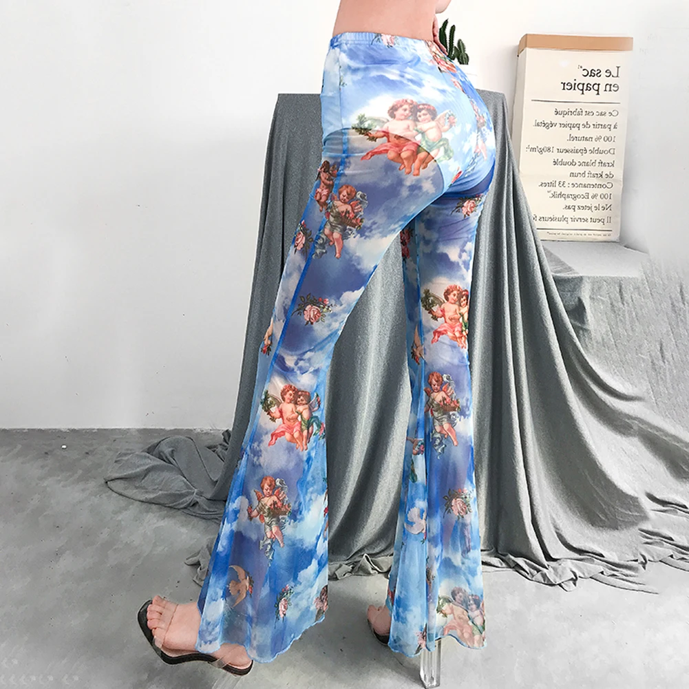 Новые женские Модные Ангел принт Высокая Талия прозрачная длинные расклешенные