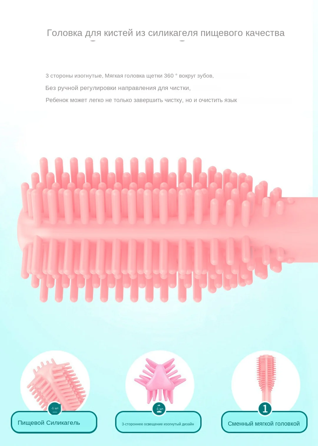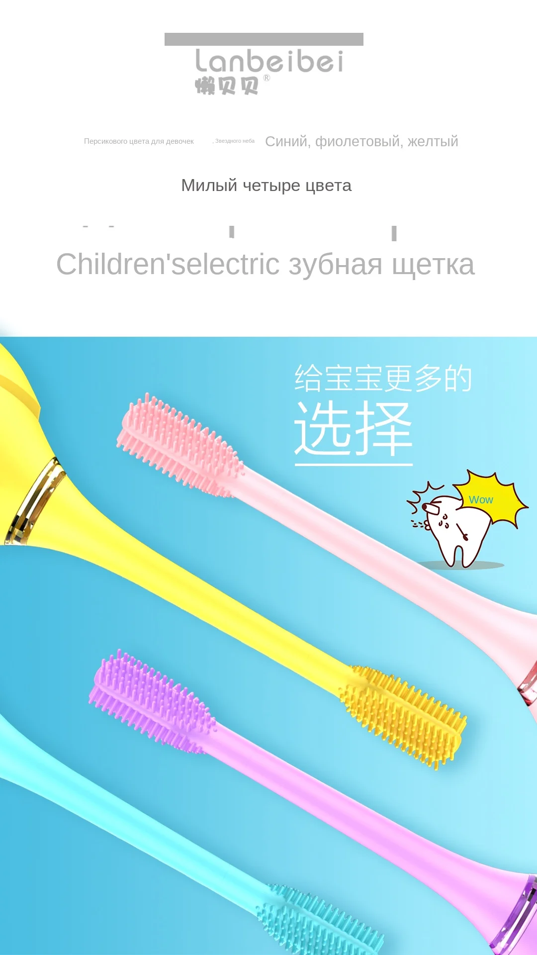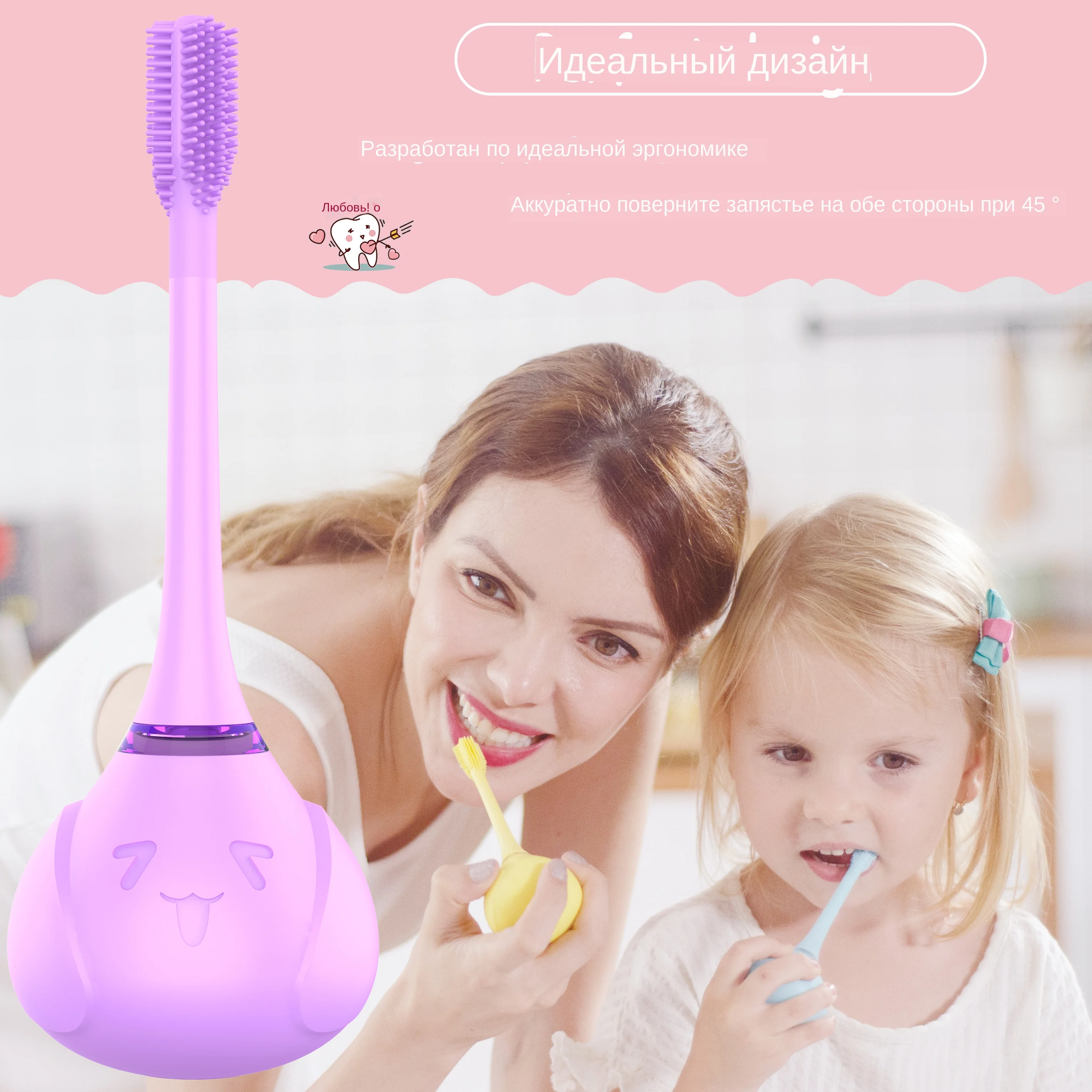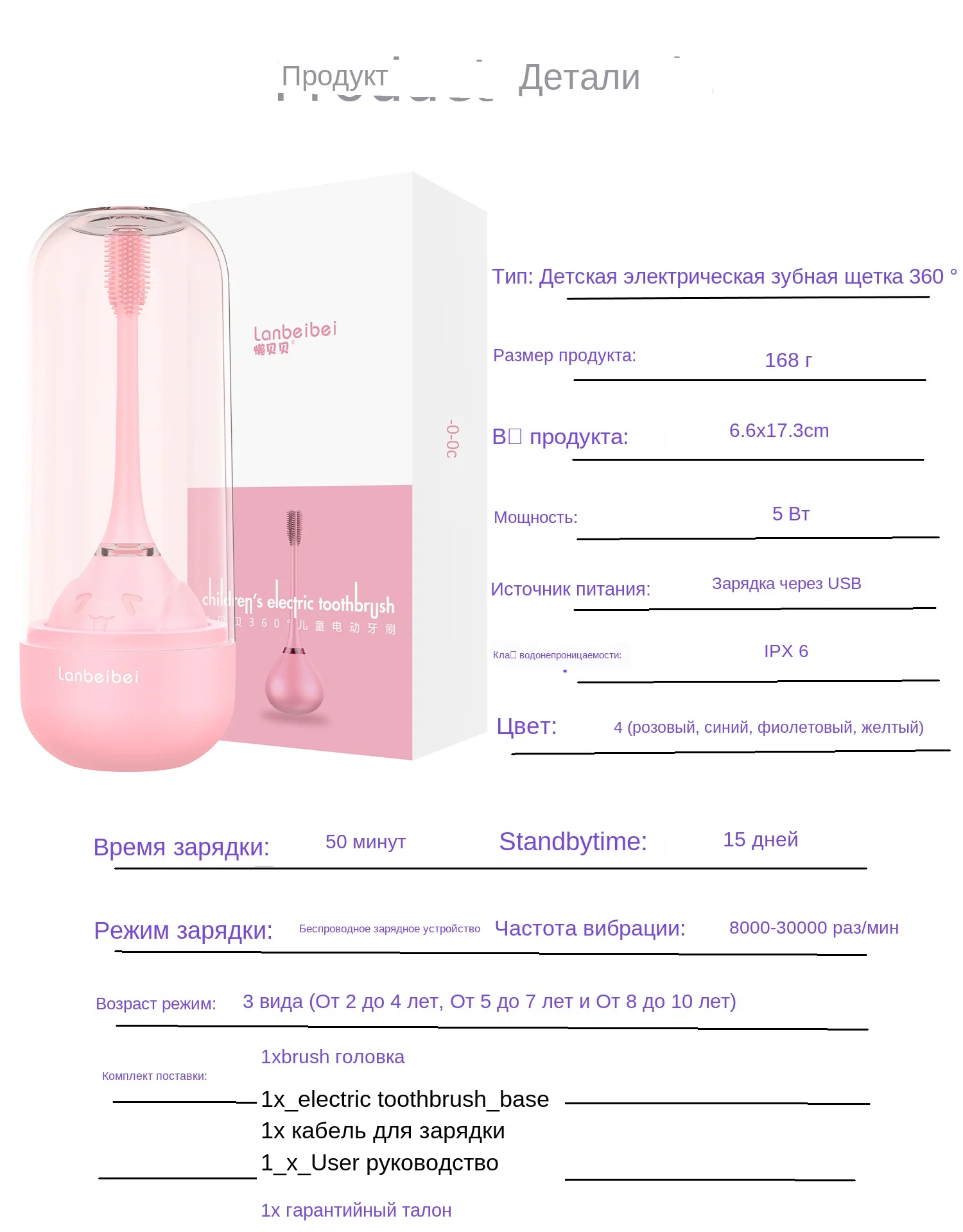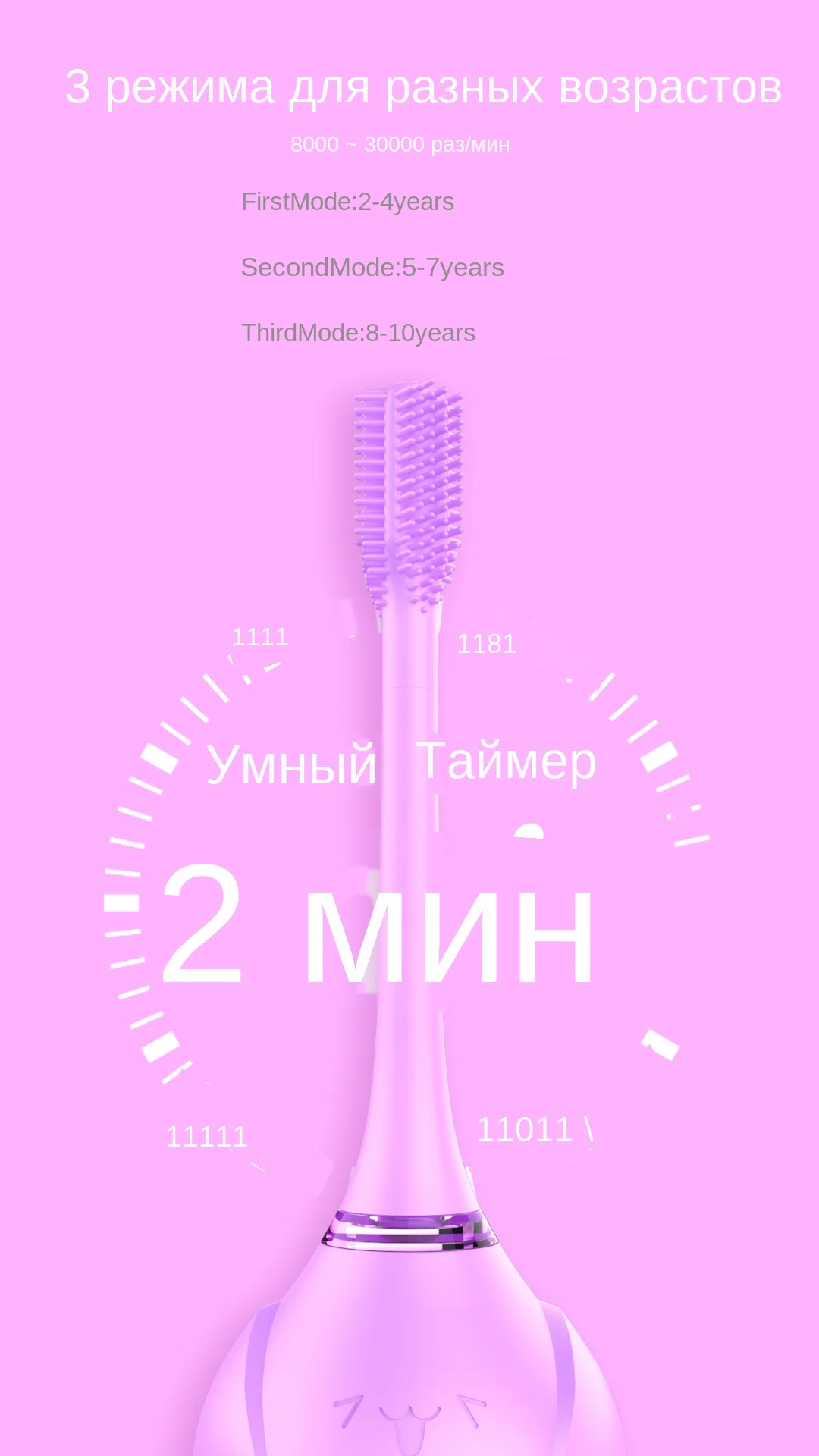 Разработан специально для От 2 до 10 лет детей Креативный дизайн: милая форма, вашему ребенку очень понравится Головка кисти: пищевой силикагель, 3 стороны изогнутый дизайн, сменный Самая безопасная зарядка: самый продвинутый режим зарядки ---- резонансная Беспроводная зарядка, нет открытого металлического листа Умный Таймер: 2-mins умный таймер чистки. Помогите Вашему ребенку развить правильную привычку чистить зубы 3 возрастных режима: 8000-30000times/min Первый режим: 2- 4 года Второй режим: 5-7 лет Третий режим: 8-10 лет Время работы в режиме ожидания: 15 дней после 50 минут полной зарядки
