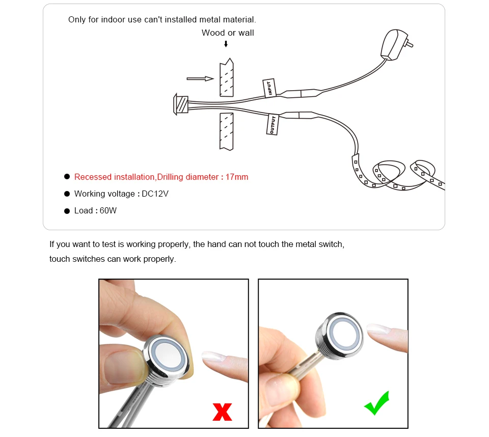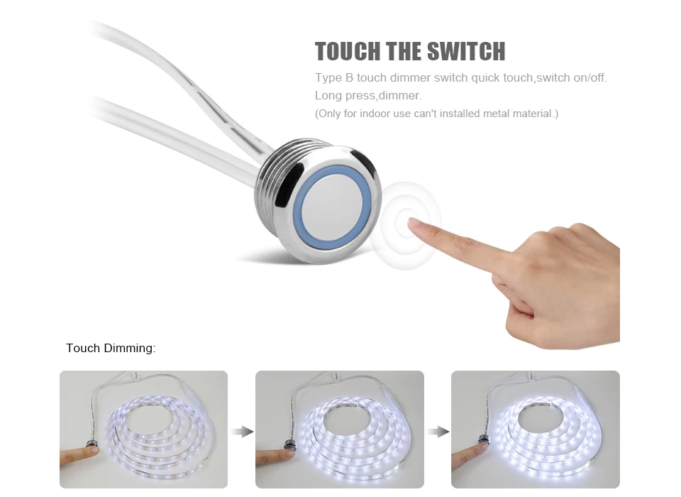 Тип: Светодиодная лента 12 В 2835 с сенсорным переключателем Тип светодиодов: 2835SMD Количество светодиодов: 60 светодиодов/м Класс водонепроницаемости: IP65 Длина: 1 м/2 м/3 м/4 м/5 м Цвет светильника: белый/теплый белый Цветовая температура: белый (6000k-6500K); Теплый белый (2700K-3500K) Яркость: плавная регулировка, Длительное нажатие на переключатель для изменения яркости Источник питания: адаптер питания 2A Идея для шкафа, шкафа, лестницы, кухни, украшения дома