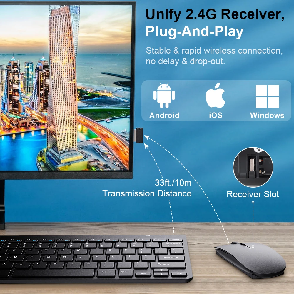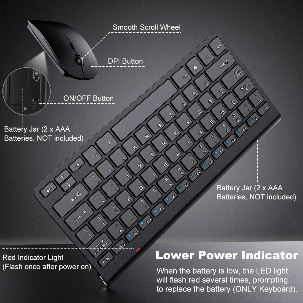 Надежное usb-соединение 2,4G-подключено к беспроводному протоколу 2,4G, нано-приемник USB соединяет клавиатуру и мышь с помощью только одного usb-порта, plug-and-play. Надежное соединение имеет диапазон 33 футов (10 метров), устраняет любые ограничения и задержки от шнура, предлагая удобство независимо от того, где вы печатаете. (Примечание: приемник 2,4G хранится внутри мыши и может быть вывезен для использования). 3 Регулируемый Точек на дюйм Уровни рациональная конструкция беспроводная мышь с 3 регулируемыми Точек на дюйм уровней (1000 / 1200 / 1600), контролировать ваш собственный скорость курсора свободно. Нет необходимости в драйверах, подключи и работай напрямую. Удобный ввод текста-конструкция Ножничного переключателя, создание тихой работы или игровой среды, избегая беспокойства других. Приподнятый дизайн для клавиатуры обеспечивает соответствующую высоту, снимает усталость запястья. Ультра-тонкий дизайн-ультра-тонкий и легкий корпус из АБС, клавиатуры, меры 11,22x5,31x0,71, сочетает в себе моду и элегантность. Очень легко носить с собой, когда вы выходите на работу. Более низкий индикатор питания-интеллектуальная энергосбережение, светодиодный светильник несколько раз мигает красным, когда батарея низкая. Клавиатура и мышь питаются от батарей AAA (не входят в комплект). Совместимость с системами Android, Win и MAC.