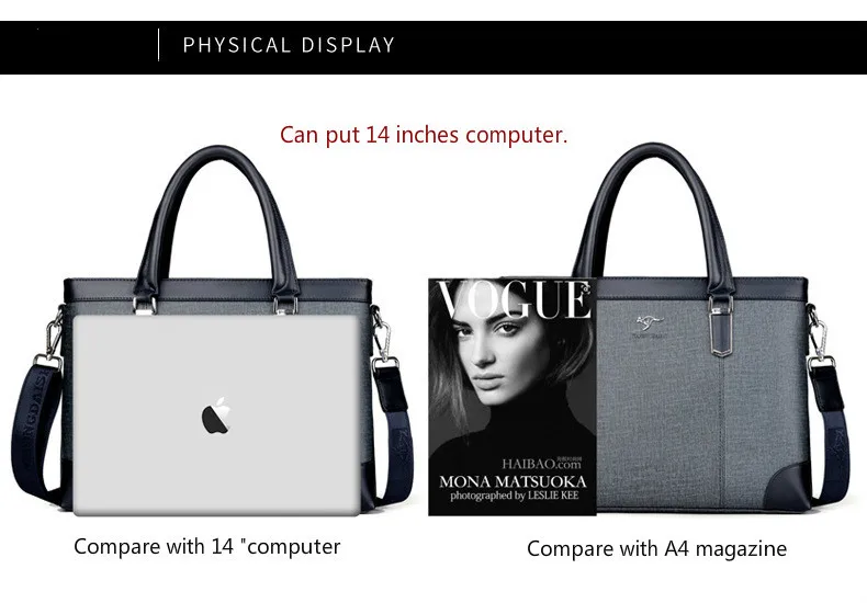 Классическая дизайнерская сумка для мужчин, деловой портфель, Компьютерная сумка, мужские Офисные Сумки, водонепроницаемая ПВХ ткань, дорожная рабочая сумка через плечо Тип: Бизнес Портфели Цвета: черный, синий Размер: 37cm-28cm-5cm Вес: 0,8 кг Ёмкость: можно положить 13,3, 14,1 дюймов ноутбук Текстура материала: водонепроницаемое ПВХ волокно Примечание: Из-за различных методов измерения каждого человека ошибка 1-3 см является нормальной, пожалуйста, поймите | |
