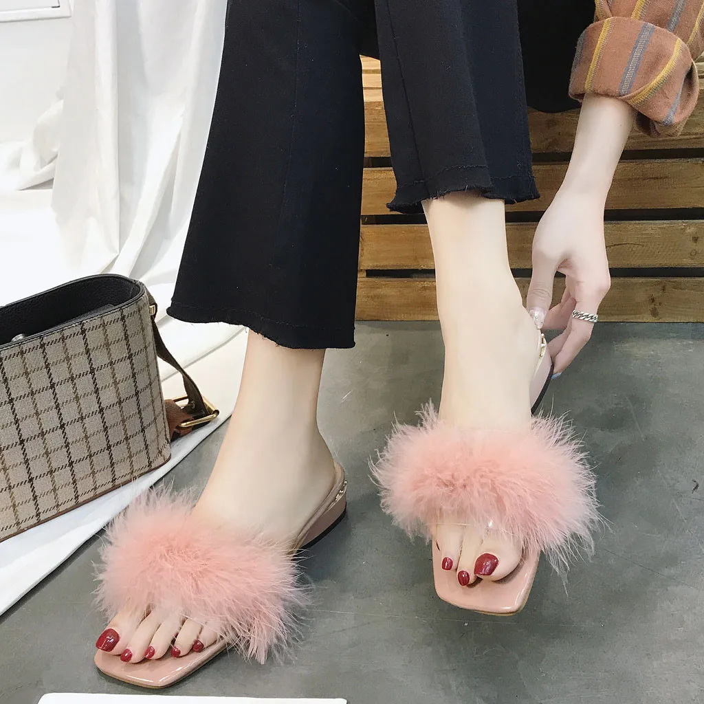Женские летние тапочки на плоской подошве с мехом; Тапочки без застежки; Римская обувь