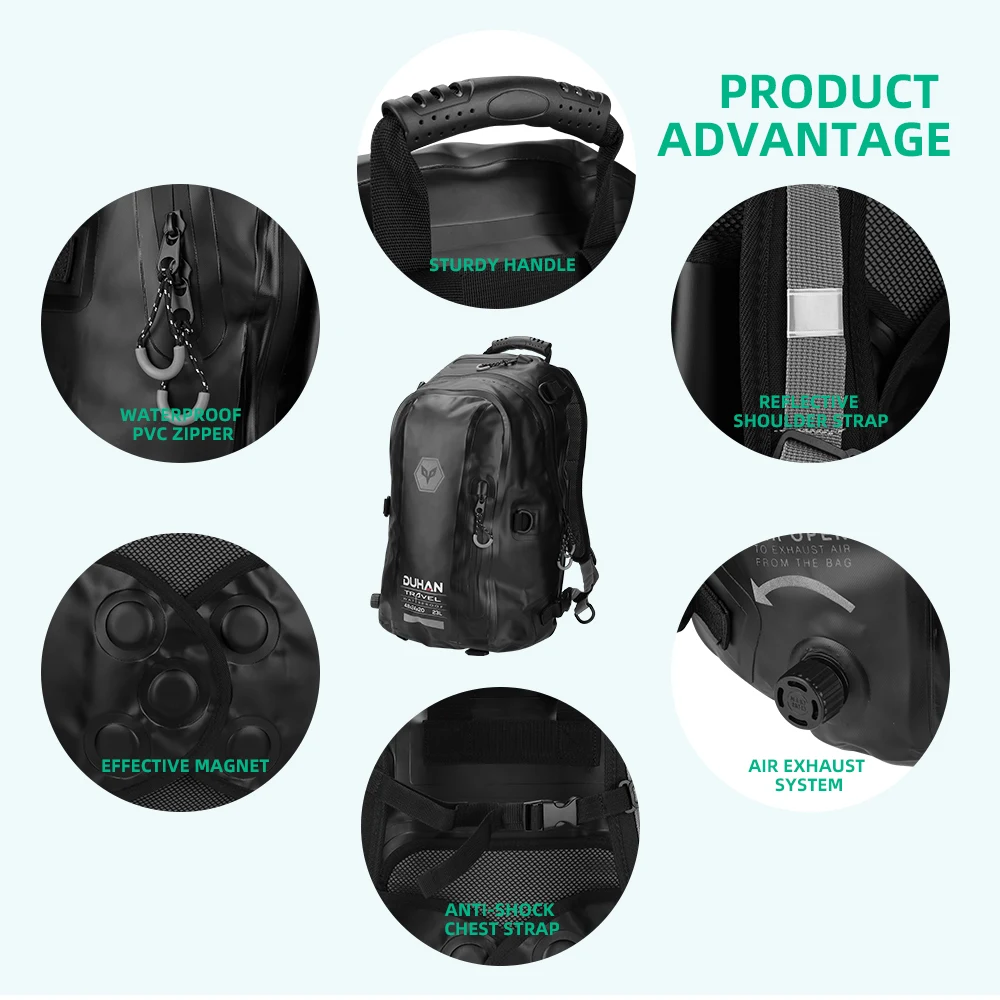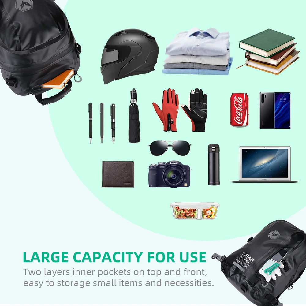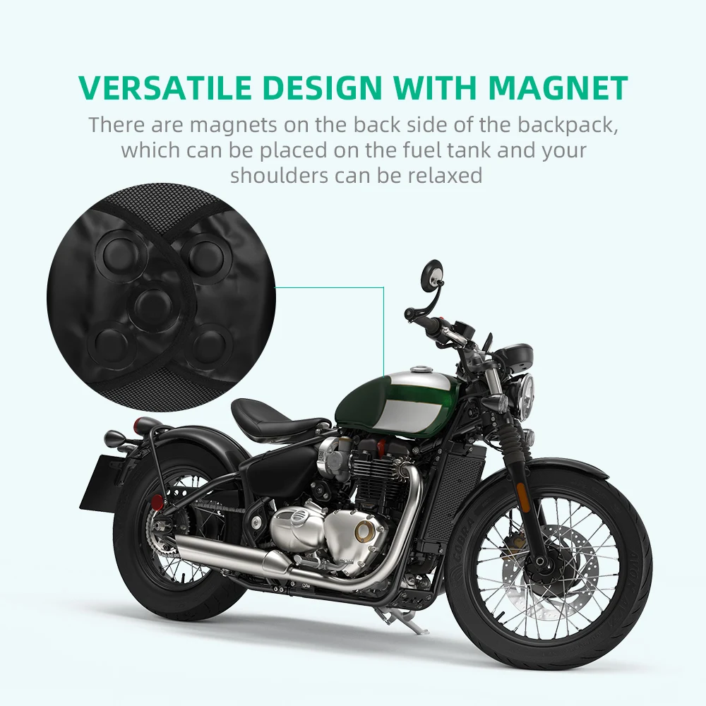 Двойное устойчивое к царапинам покрытие и антиоксидантная резинка, более прочные Большая емкость, 23 л сумка для седла может держать большой шлем. Поставляется с сумкой для шнурка, может держать один шлем Водонепроницаемый материал, водонепроницаемые молнии и карманы, блокирующие попадание дождевой воды в сумку С помощью небольшой магнитной кнопки, чтобы помочь стабильно приклеиться к мотоциклу