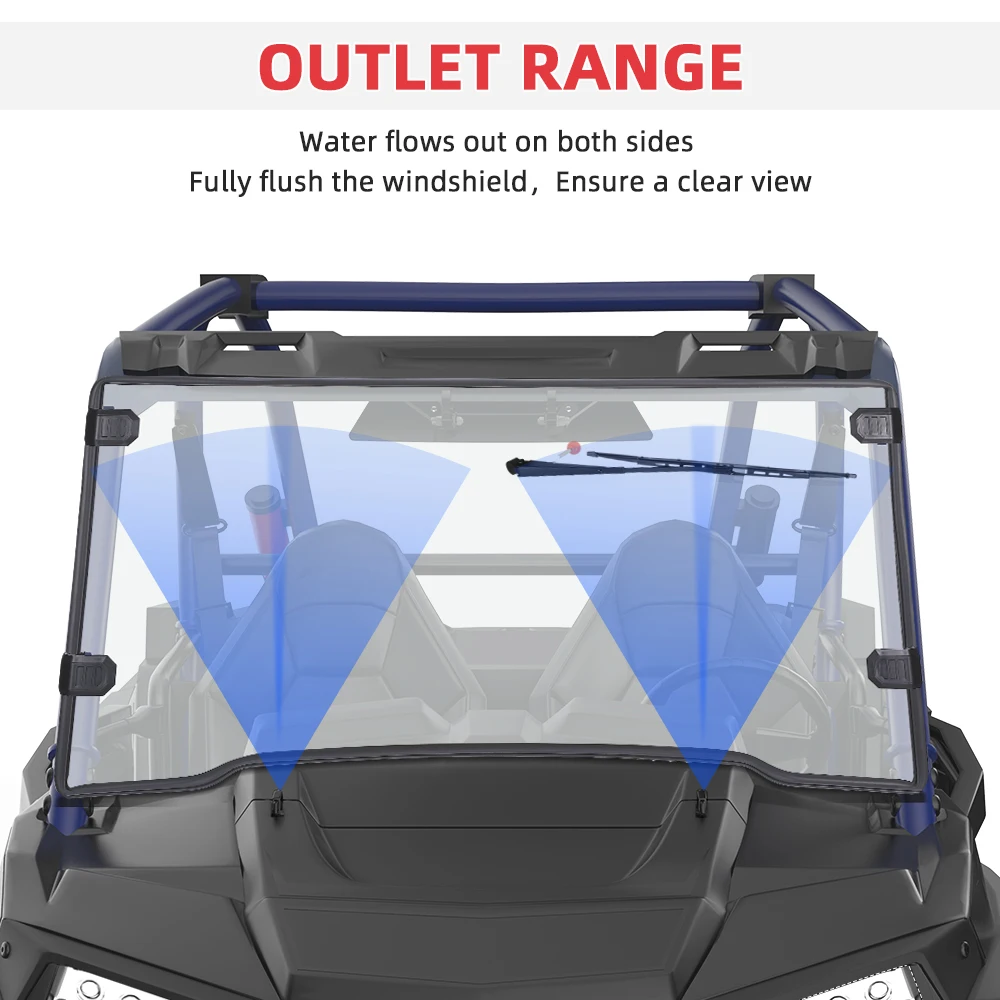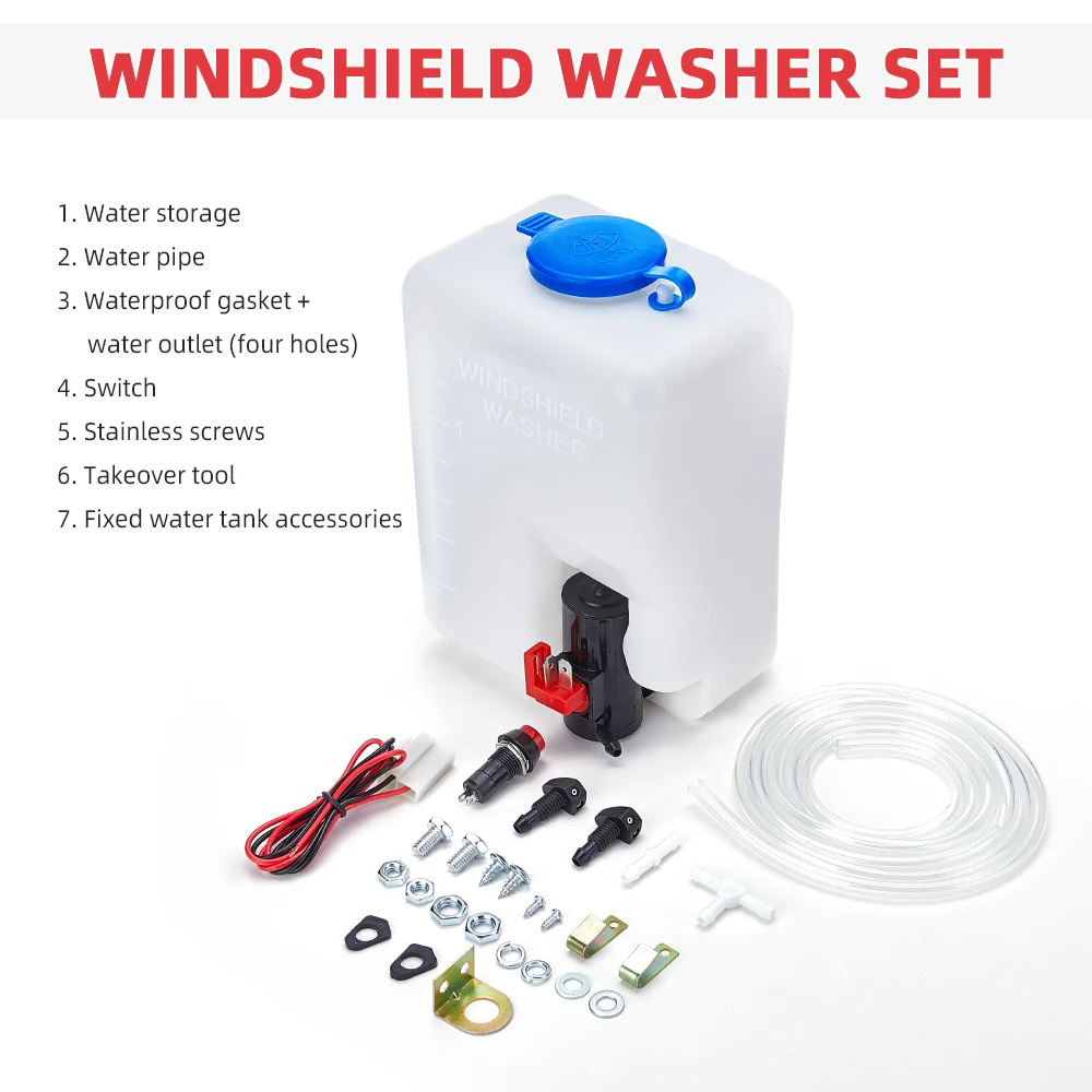 1 бутылка для мытья лобового стекла с насосом 12 В (1 LTR) 1 х труба 1 x проводной станок 1 x кнопочный переключатель для приборной панели 2 x струй 2 x сопло омывателя ветрового стекла 1 х шланг для мытья ветрового стекла 1 x разъем шланга для мытья ветрового стекла